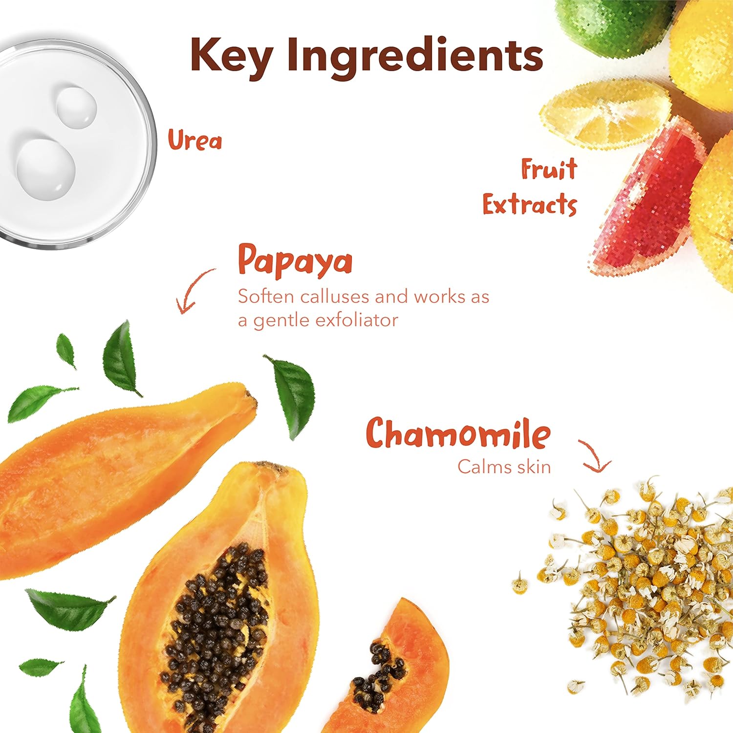 - Vegan Formula & Not Tested On Animals: It's perfect for your sensitive skin and it's made for all skin types. Papaya, Lemon, Apple, Orange and other botanical, flower extracts naturally peel away calluses while Chamomile extracts moisturize and soften dry skin so that it feels soft like a baby’s foot