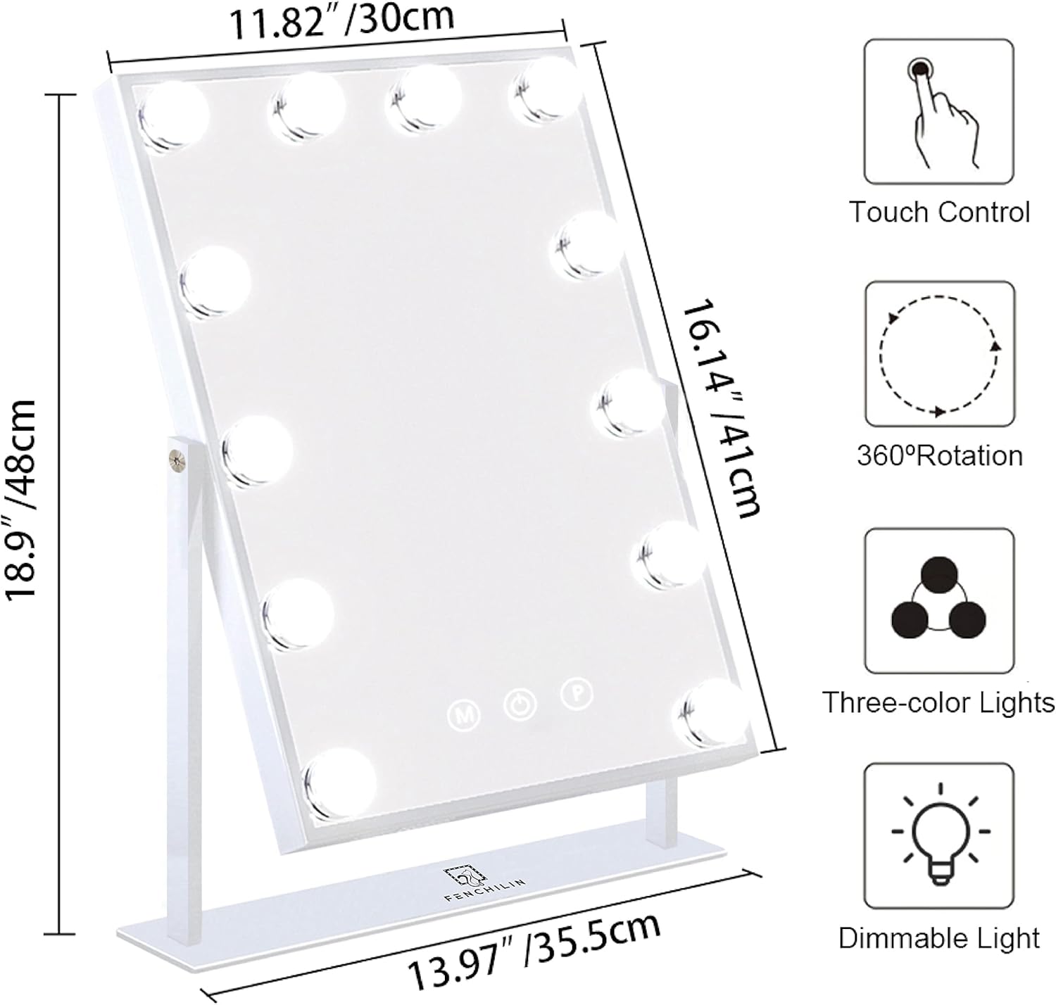 - Fenchilin makeup vanity mirror with lights is an idea vanity mirror that fits all sizes of your dressing table,13.97" X 18.9" size, solid with metal frame and base, built to withstand heavy use on your desk, the high-definition mirror makes your makeup more clearer