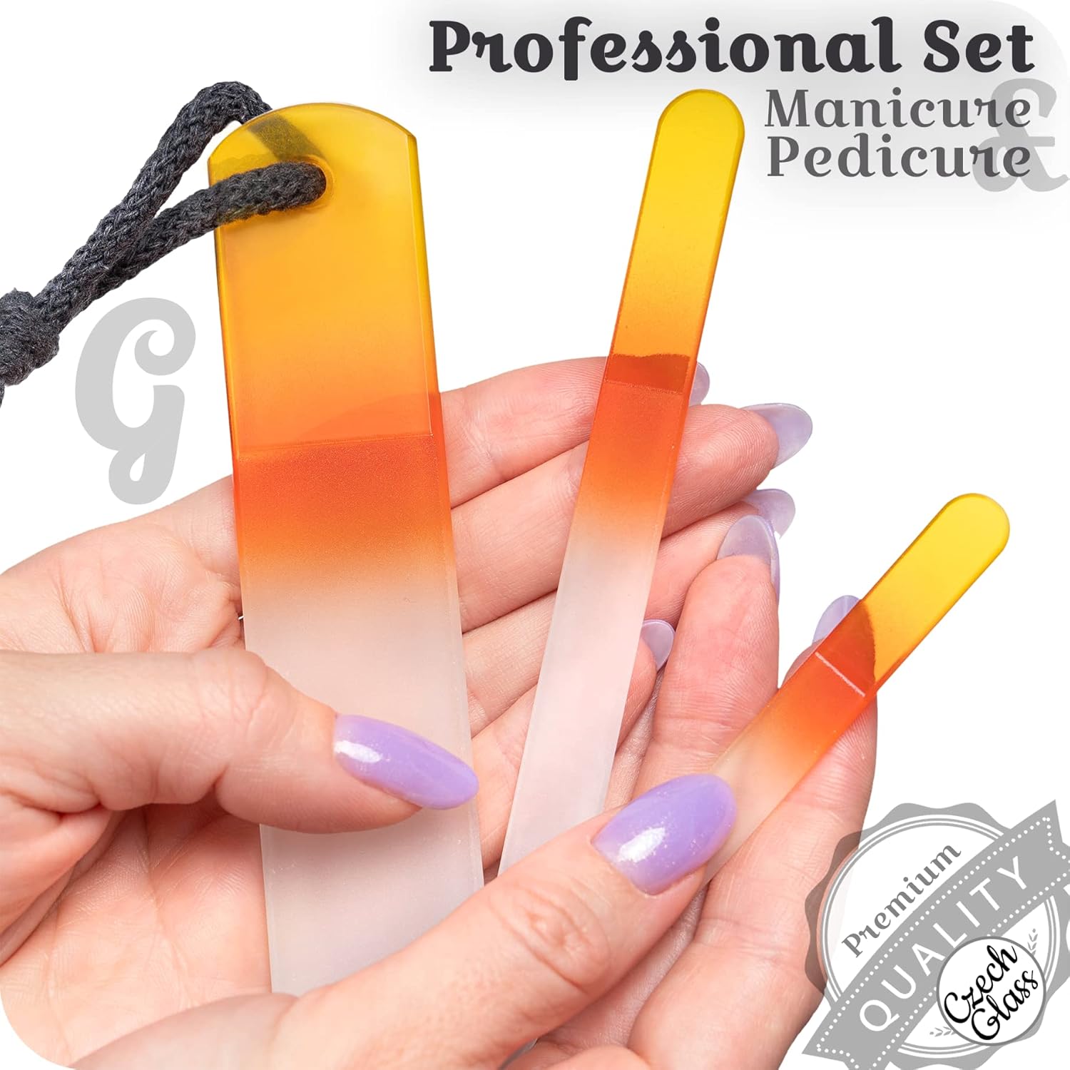 - Complete Nail & Foot Care Set β 3 pcs Czech glass tools: mini nail file for precise touch-ups, medium nail file for shaping natural nails, and a glass foot file callus remover (hard skin & cracked heels). Compact manicure and pedicure kit for home.