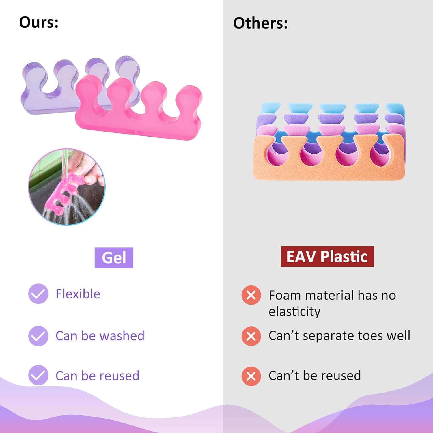 - 🍁【Reusable, easy to clean】 Toe Separators for Pedicurecan be cleaned repeatedly, and jelly material that can be used multiple timesis not easy to deform. Upgraded version of Foam pedicure toe separator. Rinse once with water before use.【Service】:We love our customers,If you are troubled by product problems,please contact us as soon as possible to solve it for you,including return or exchange.