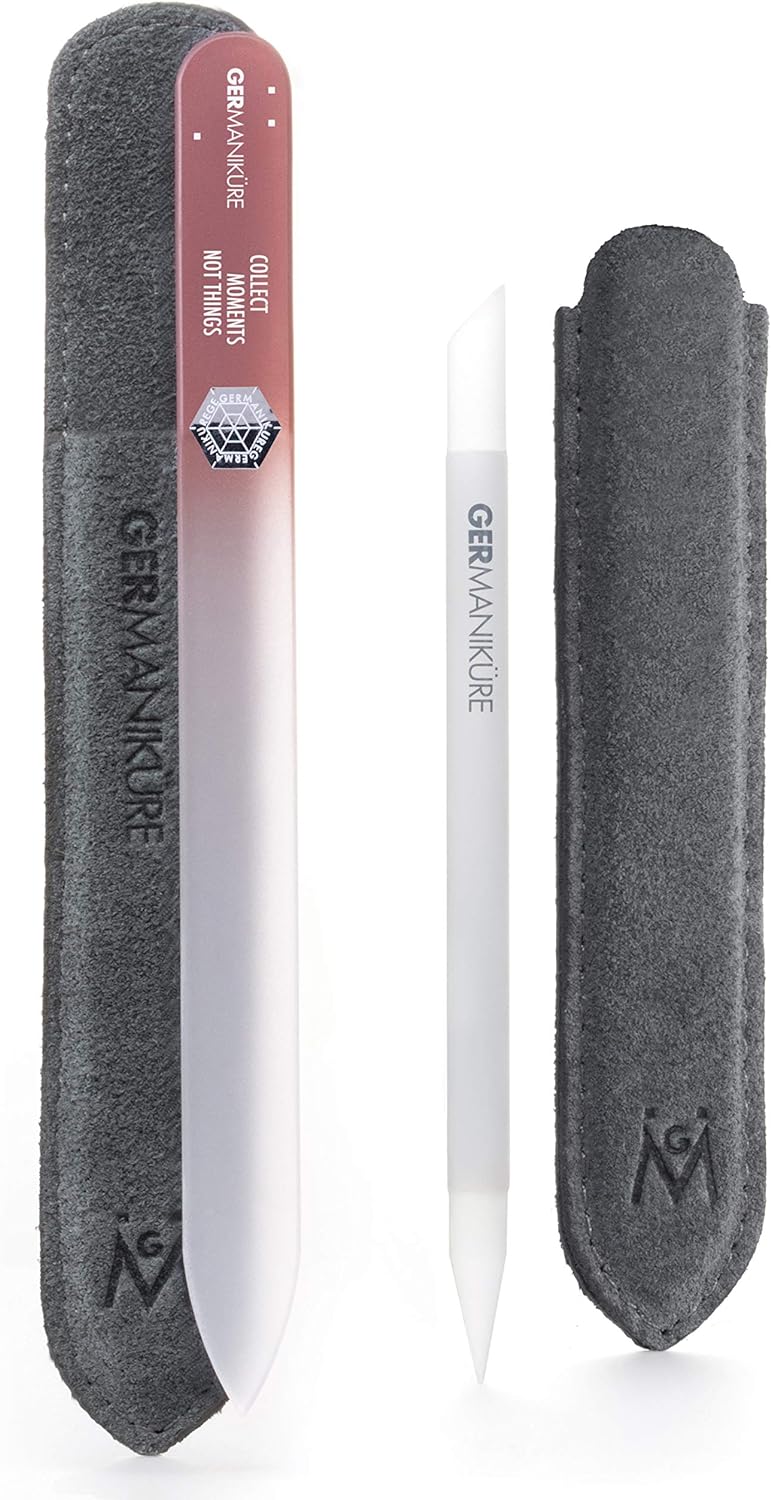 GERMANIKURE 2 Pc Glass Bundle - Crystal Glass Cuticle Stick & Collect Moments NOT Things Nail File Set in Suede Sleeves – Handmade in Czech Republic – Cuticle Pusher, Callous Remover, Fingernail File
