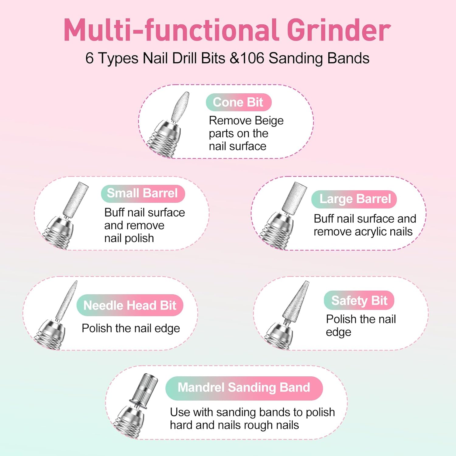 - Practical Acrylic Nail Kit: Electric nail file equipped with 6 nail drill bits and 100pcs sanding bands, it also designed with forward and reverse rotation direction, it is suitable for nail technicians for easy and effective use on both the fingernails and toenails.If you have any problems with our product, please do not hesitate to contact us and we will response you in 24 hours and try our best to assist you find a prompt solution