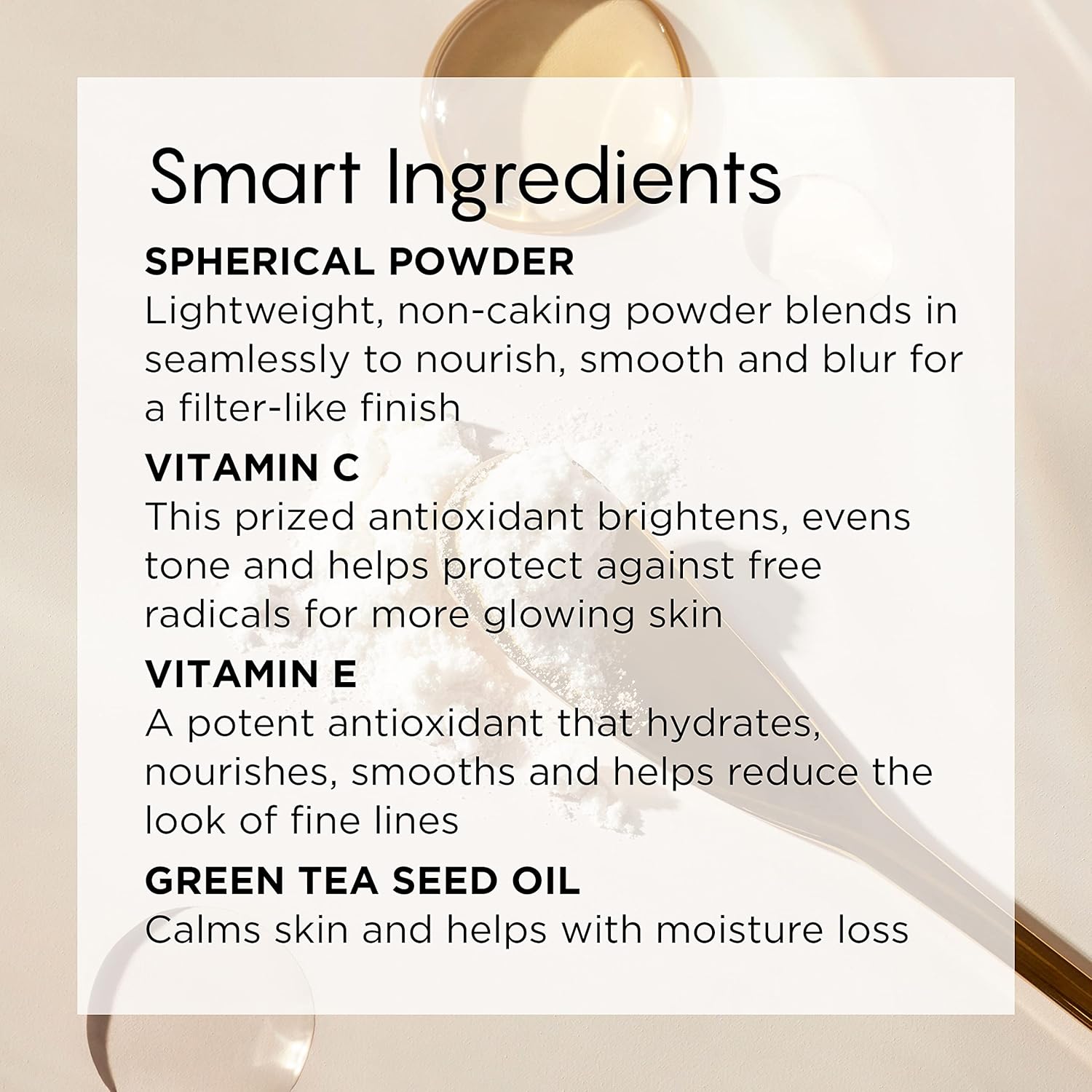 - INGREDIENTS: SPHERICAL POWDER A lightweight, non-caking powder blends in seamlessly to nourish, smooth and blur for a filter-like finish VITAMIN C This prized antioxidant brightens, evens tone and helps protect against free radicals for more glowing skin VITAMIN E A potent antioxidant that hydrates, nourishes, smooths and helps reduce the look of fine lines GREEN TEA SEED OIL Calms skin and helps with moisture loss
