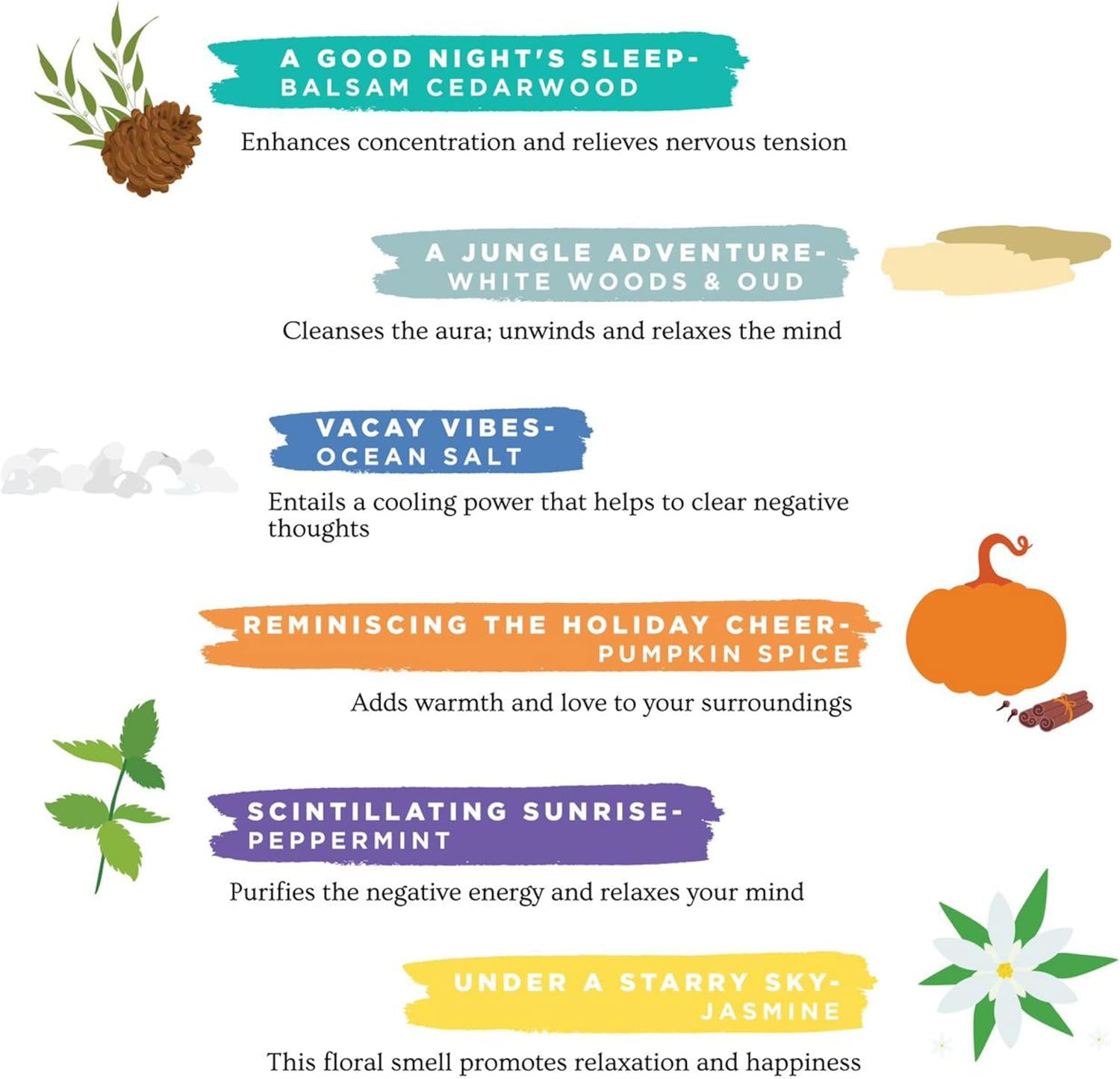 - Fragrance Notes โ This incense pack combines uplifting woody notes with rustic undertones with fragrances like Balsam Cedarwood inscents, Jasmine incense, White Woods & Oud insenses, Ocean Salt, Pumpkin Spice Incense. Suitable for meditation rooms, bedrooms, living areas, and even office spaces.