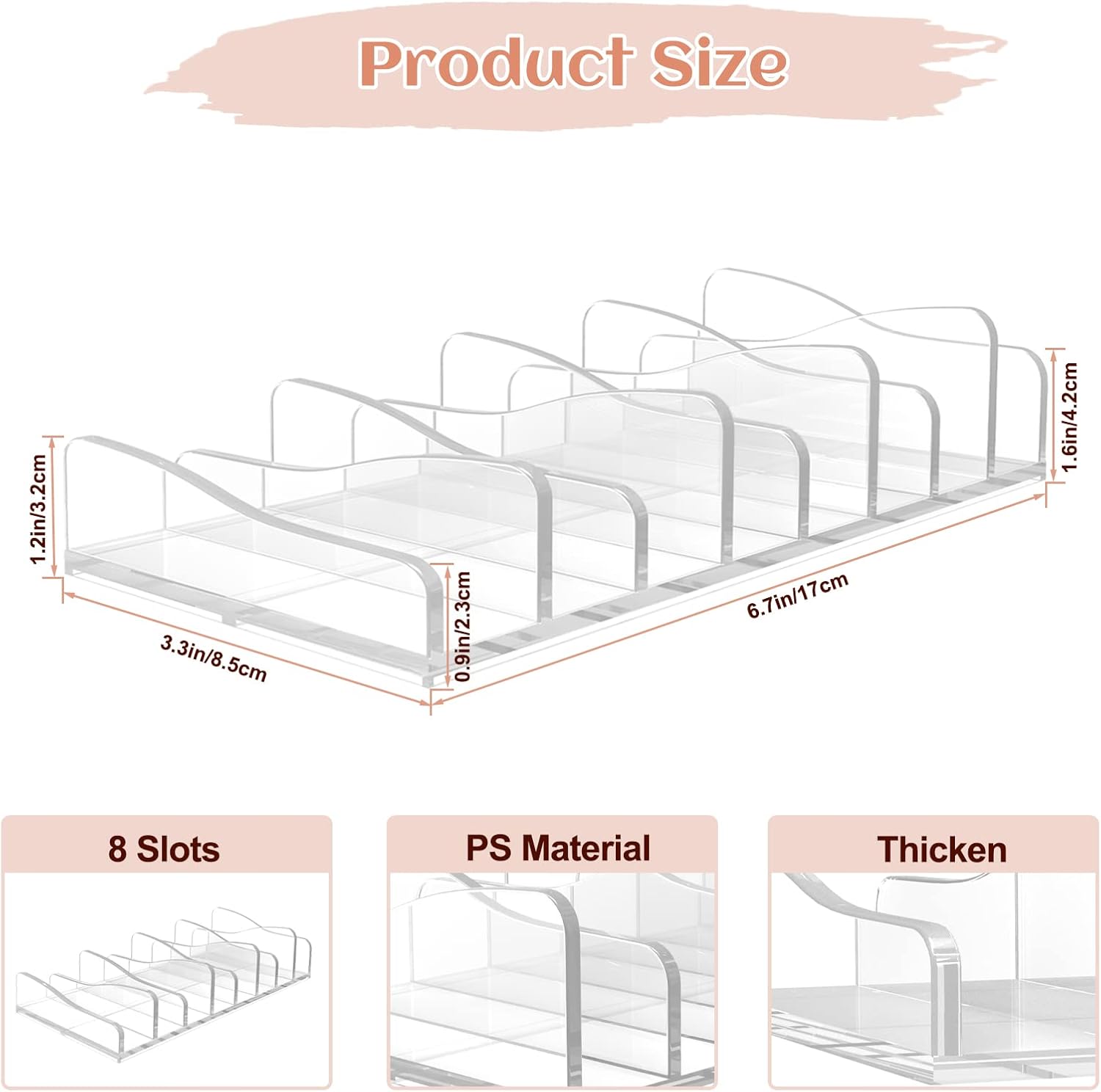 - 【Perfect Size】8-slot eye shadow palettes stand size: 6.6 x 3.5 x 2 inches, each inner measuring at 6.1x1.1 inches. you can stand the acrylic cosmetic organizer upright on the counter or lay it flat in a makeup drawer to save space.