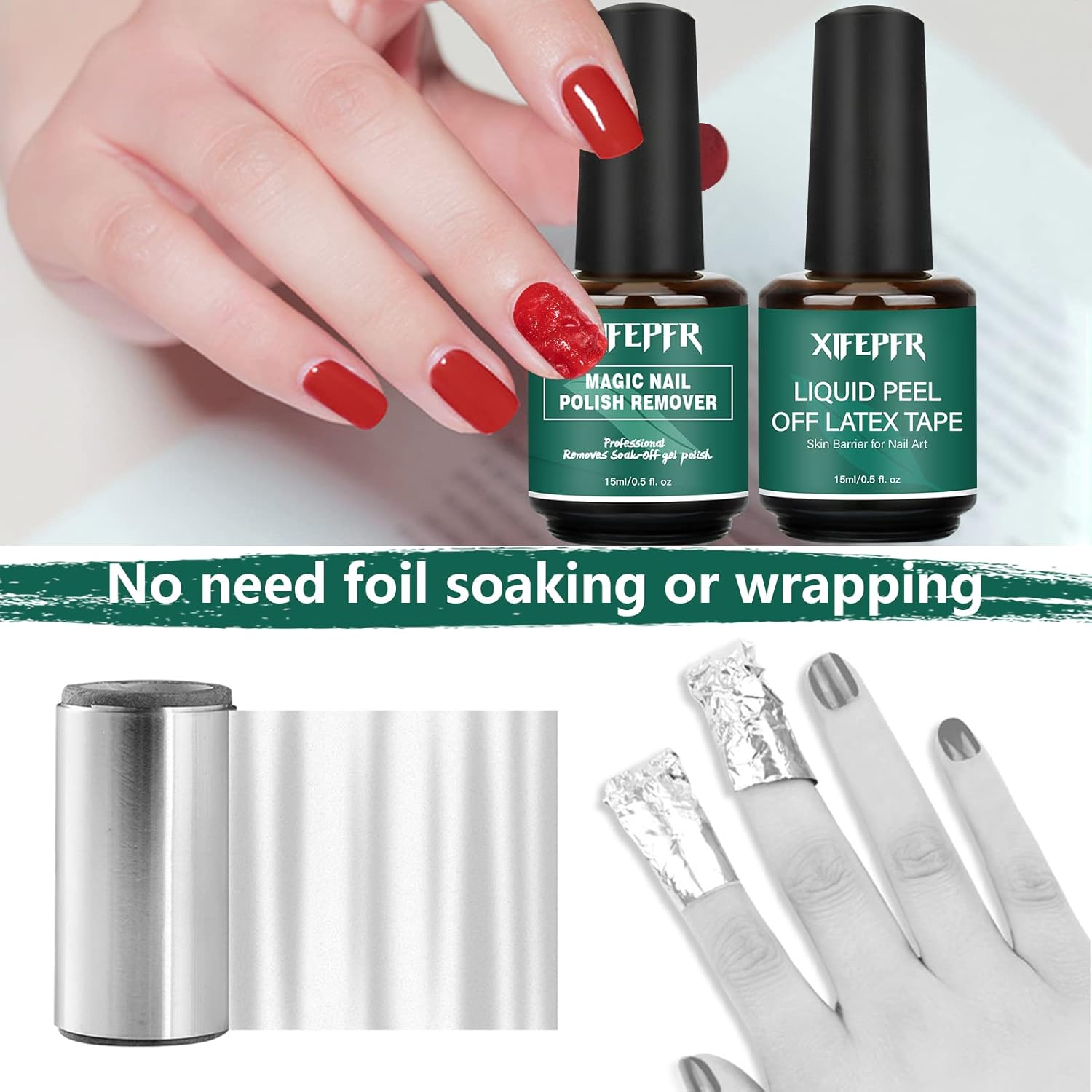 - Gel Nail Polish Remover Kit: This gel polish remover kit includes 2 pack gel nail polish remover, liquid peel off latex tape, cuticle oil pen, cuticle pusher, cuticle peeler, nail file, gel polish remover wipes and nail cotton pads. The all-in-one kit helps you quickly remove gel nail polish, you can easy manicure at home, no need to go to a professional nail salon, saving time and money.