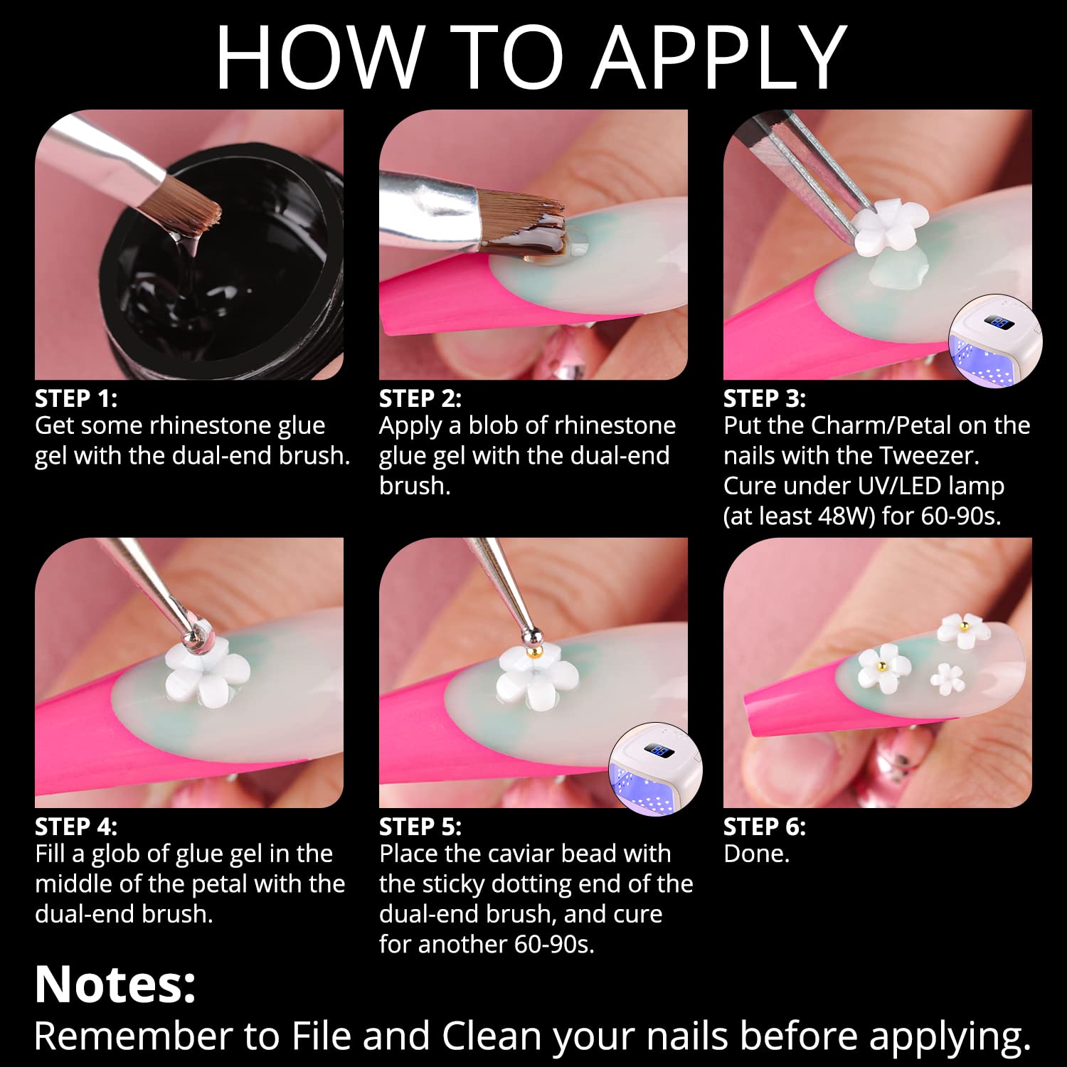 - WHAT YOU WILL RECEIVE -- The package contains 2 boxes of ornaments for manicure and 1 pot of 8ml No Wipe rhinestone glue gel with necessary dotting pen and tweezer. The embellishment set includes bling starry AB gems for nails, AB white flatback pearls, metal ball chain, 3D blossom / flower, etc.