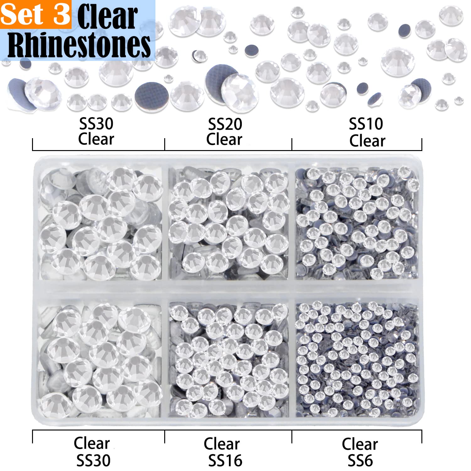 - Size: 5 Sizes each color, They are SS6: 2mm, SS10: 2.5mm, SS16: 4mm, SS20: 4.5mm and SS30: 6.5mm. Including a large number of large-size rhinestones, enough to succeed a complete clothing and shoes crafts project.