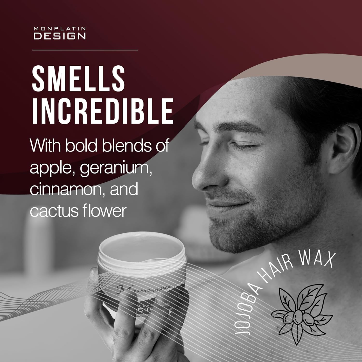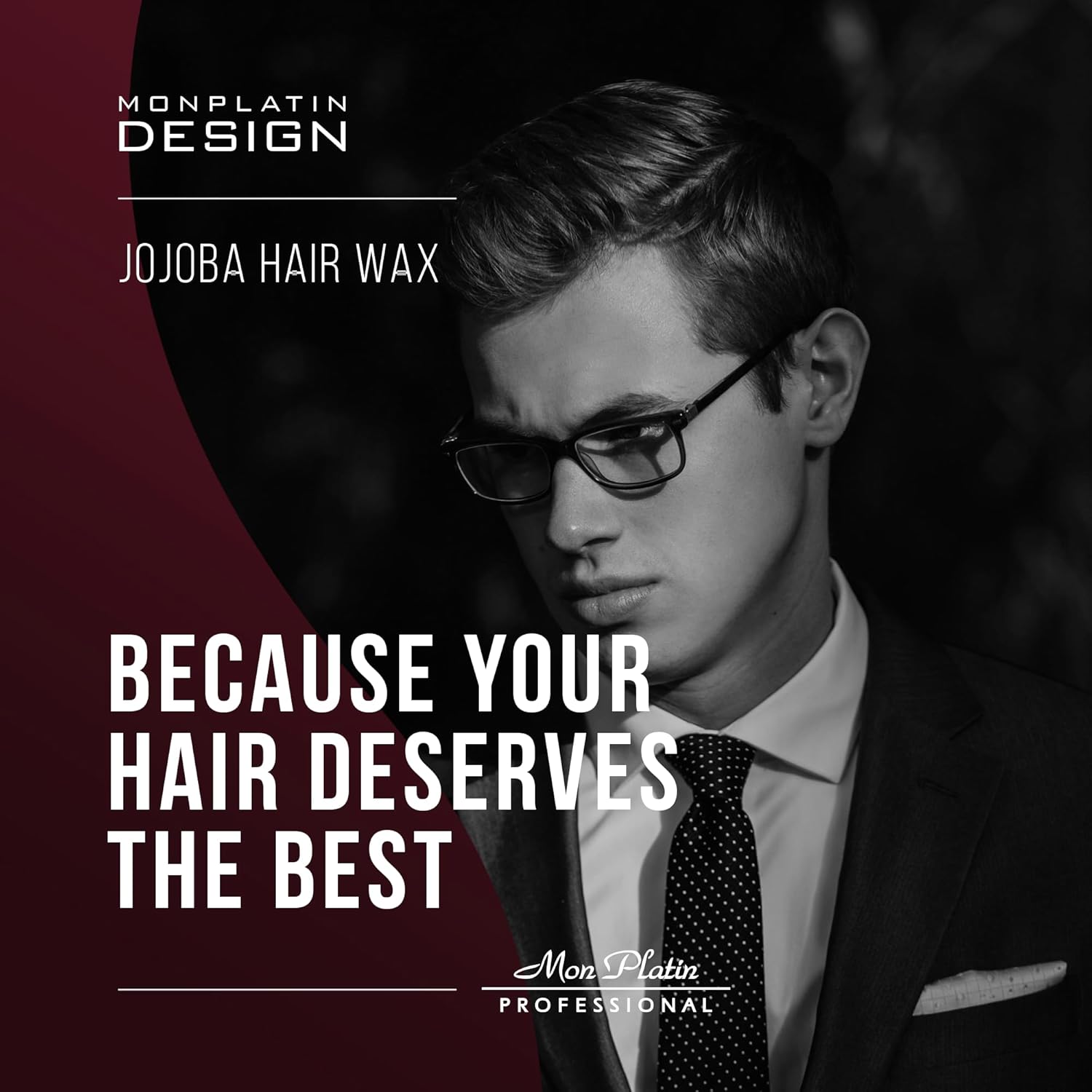 - NOURISHING TREATMENT: Say goodbye to dry, lifeless locks! Our Jojoba Hair Wax is not just your average styling product; it's a nourishing treatment that showers your hair and scalp with organic jojoba extract goodness and smells divine, it's the ideal choice for your daily styling routine. Mon Platin menβs hair wax is easy to rinse out and leaves no sticky or greasy feeling, No residue, just well managed hair.
