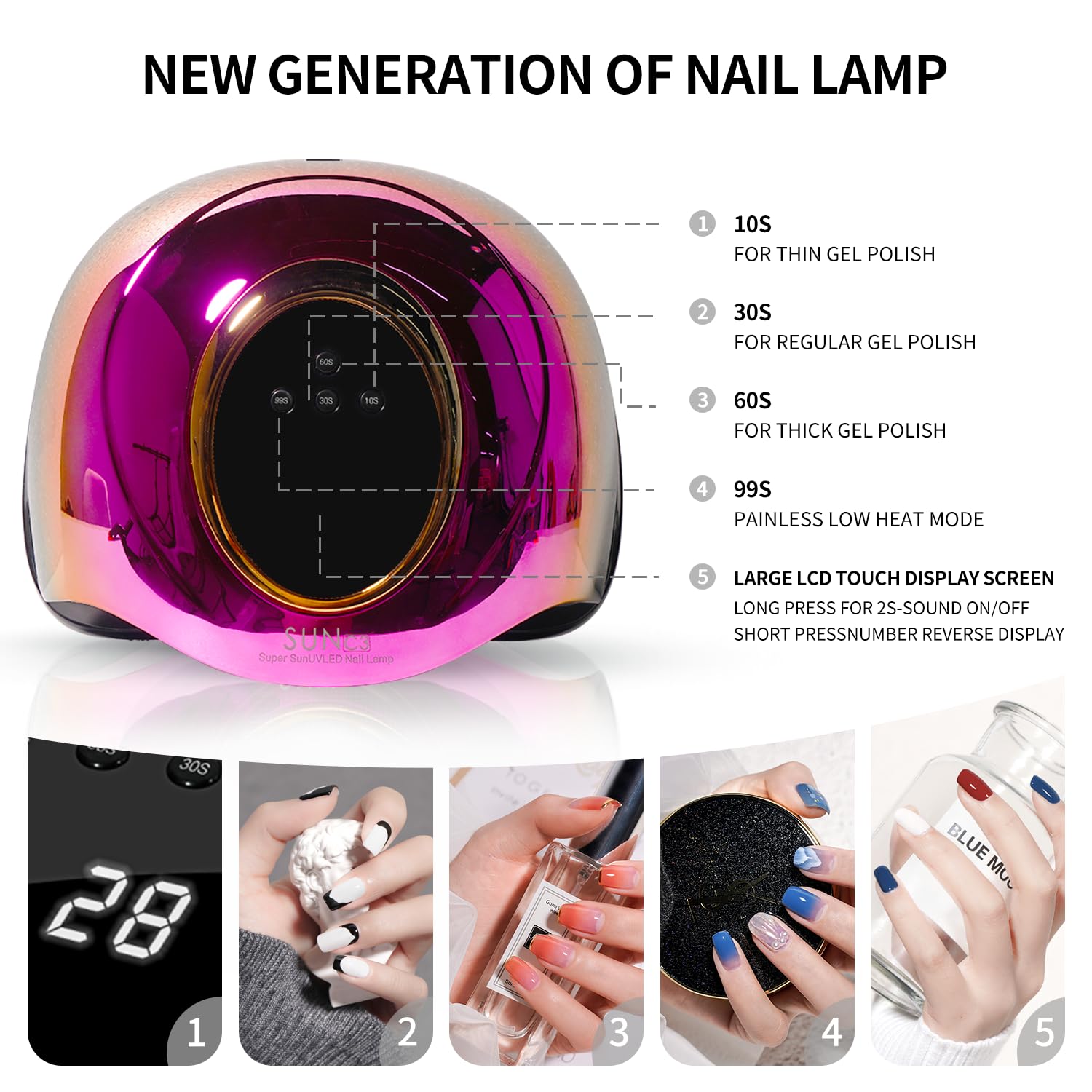 - 👍【Large LCD Display & 4 Timer Setting】Our uv led nail lamp has 4 timer setting(10/30/60/99S) can show your usage time on large Digital LCD screen, makes your curing process more visible. Flexible drying options with 4 timer setting, the power of nail light between 288W(10/30/60S)-72W(99S) can follow your different gel polish's requirements.