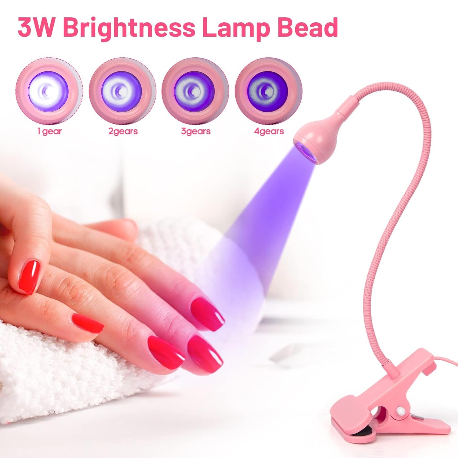 - 【Gooseneck LED Nail Lamp】AORAEM nail lamp made of aluminum alloy which has good durability. LED nail lamp is designed with a 360-degree rotatable neck and strong clip, which can be freely bent and adjusted to any angle, giving you great flexibility to cure different nail manicures.And the clip fixed smoothly, suitable for fixing to the bedside table, office desk, laptop desk, headboard, etc. It's extremely convenient to carry nail lamp around to enjoy your DIY nails.