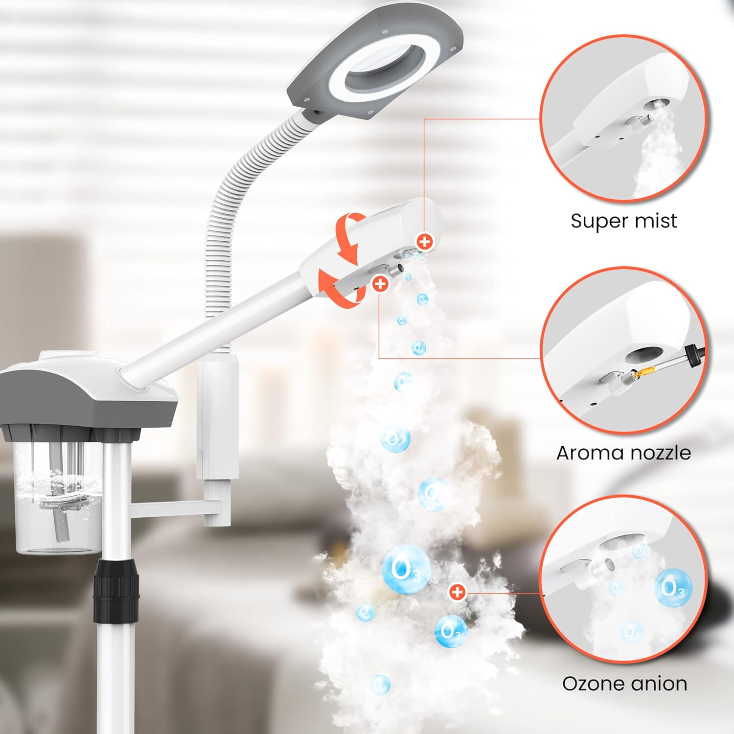- 3X Magnifying Lamp: Facial steamer for esthetician with adjustable LED light, 3x magnification lens, can accurately complement the shadowless magnification, help the esthetician to observe the customer's skin in detail, assess the skin condition; The light is very soft and won't hurt your eyes