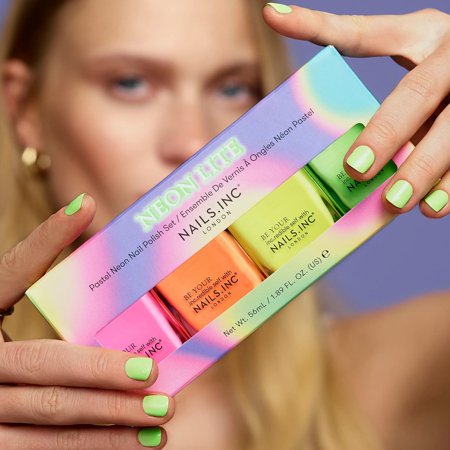 Nails Inc Neon Lite Nail Polish Quad, Neon Glow Enhancing Shades, Fast Drying, Long Lasting, Chip Resistant, Air Dry Manicure,Vegan, Cruelty Free, 4 Piece Set