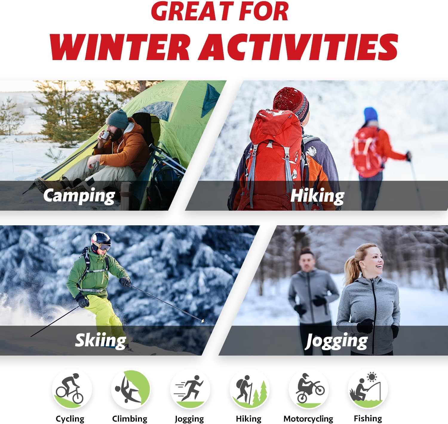 - Recommended Uses For Product : Camping, Hiking, Fishing, Skiing