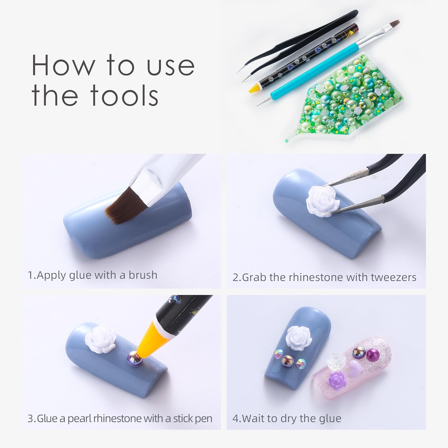 - đź’ŽUseful tools - These pearls rhinestones have a flat back, which is excellent for easy placement.and you can pick up any large or small pearls and rhinestones with the crayons we bring along. And use the brush to smooth out the glue, these tools will work very well.