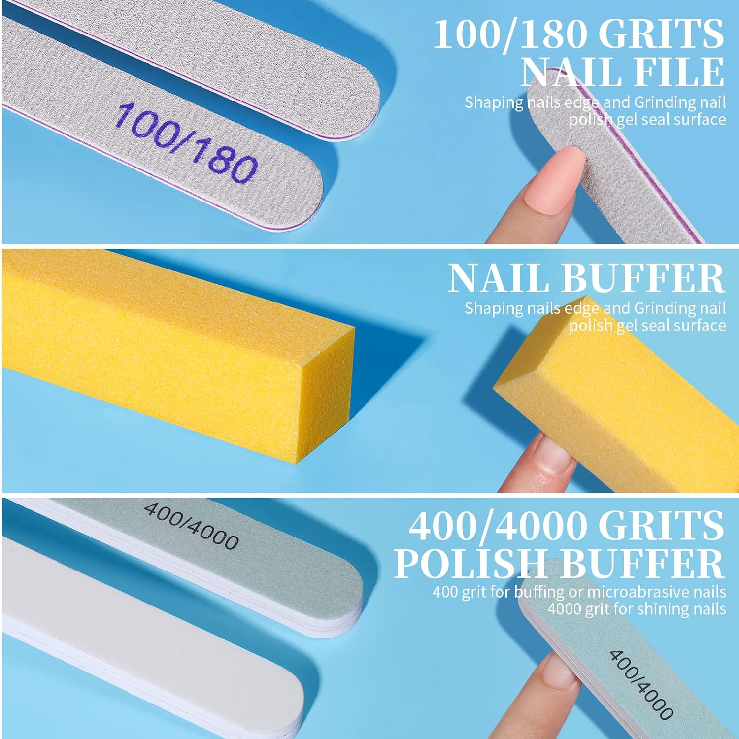 - Nail files and buffer : made of quality adhesive tape and emery board materials. 100 grit nail files are used for taking down the length of natural or acrylic nails and shaping the side walls and free edge. 180 grit nail file to contour the whole nail and during manicure to shorten or shape natural free edge. 400 grit nail files and buffer for removing small bumps, ridges or discolorations. 4000 grits buffer buffs and smooths the nails, being perfect for adding an ultra shine