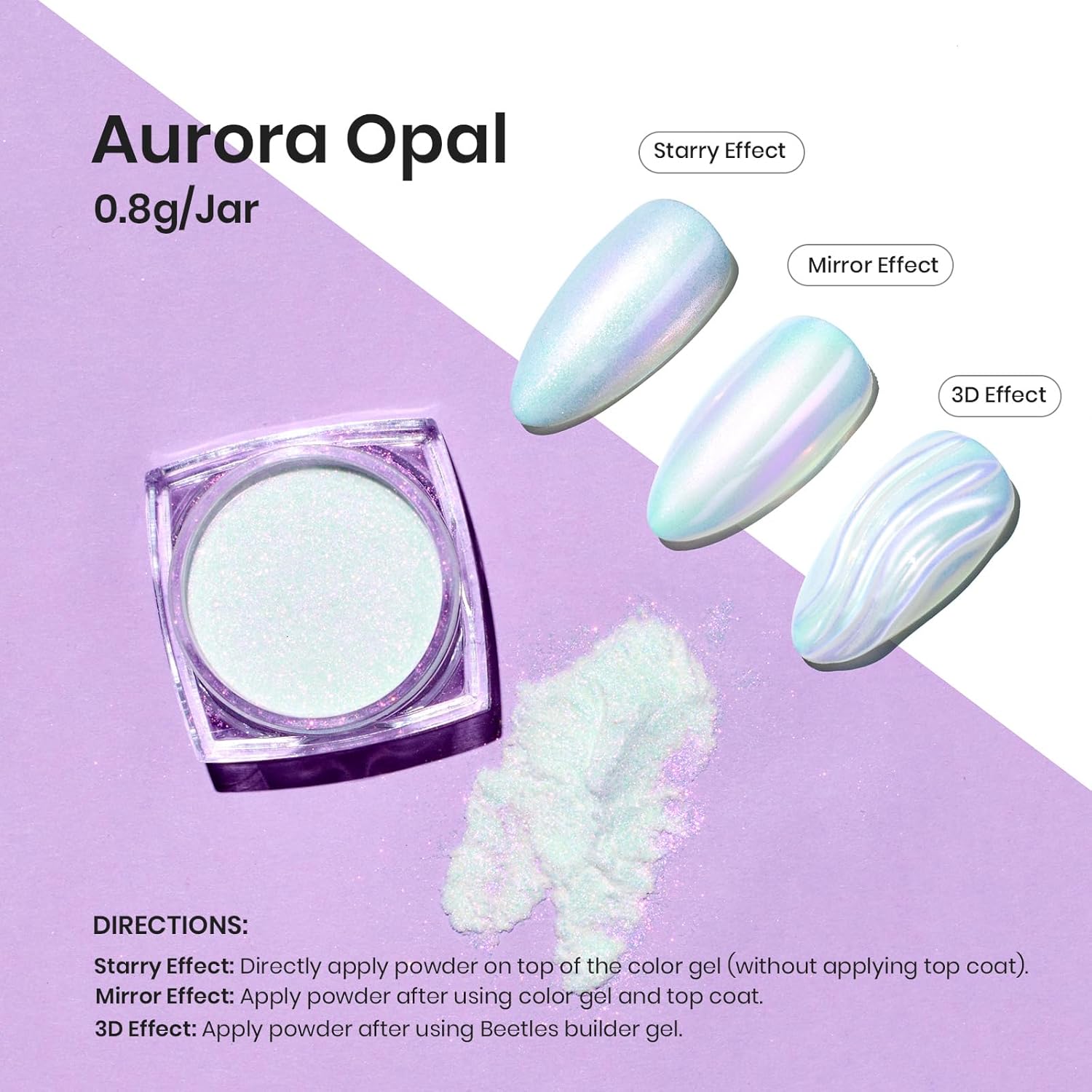 - Wide Application:Beetles chrome nail powder is suitable to be applied on UV gel nails, acrylic nails, natural nails etc, a helpful DIY tool for nail art design. Different polish will give different actual effect.Trying different polish can also bring more fun to you with the chameleons powder.