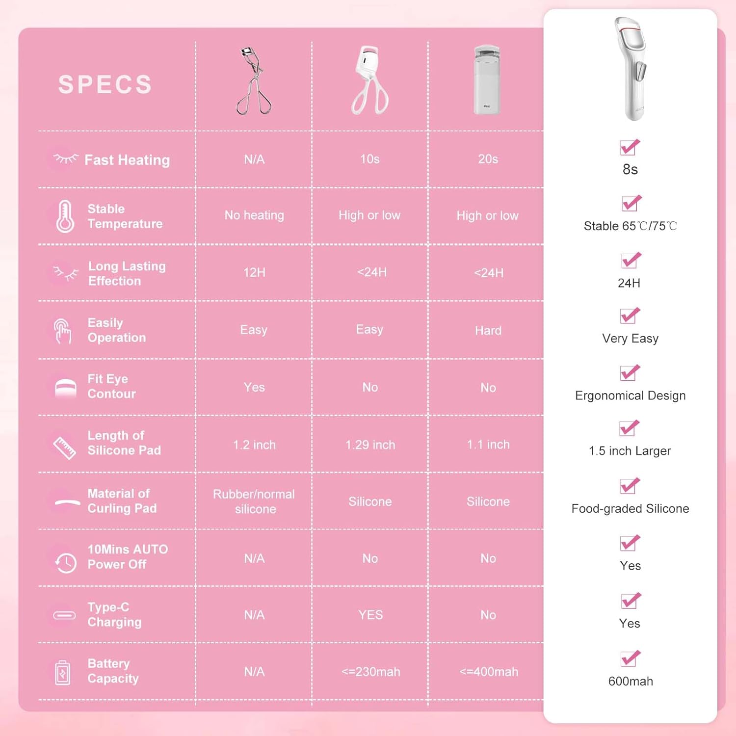 - ADVANCED SMART TEMPUTURE CONTROL SYSTEM: Heating Eyelashes Curler make the accuracy of temperature is improved 60%, achieved the curling temputure fluctuating only at +/-3 Β° after fully warm up, not +/-10 Β° like others heating eye lash curlers. more stabilized curling temputure offer quantity of heat to get better curling result and long lasting.