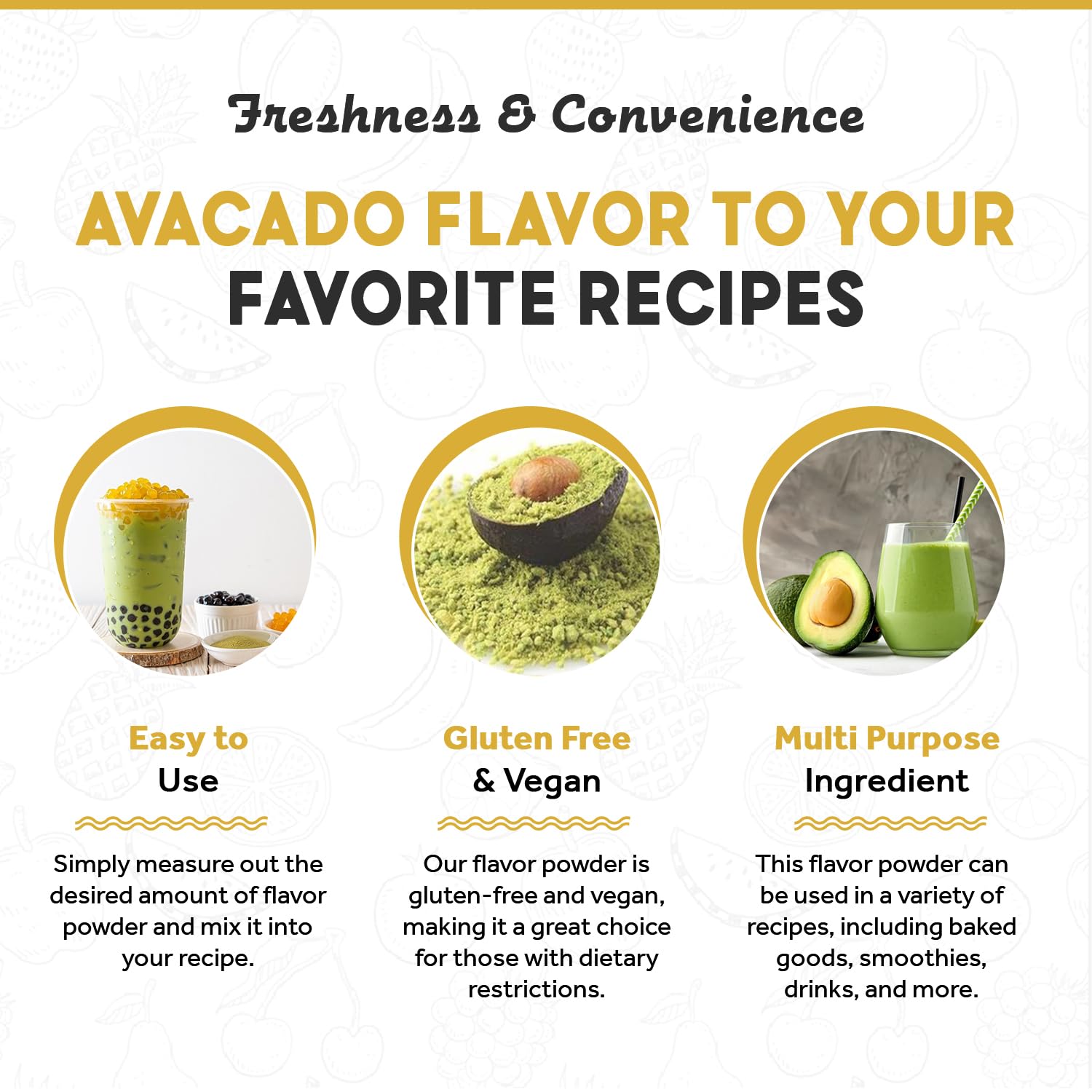 - ๐๐๐ฌ๐ฒ ๐ญ๐จ ๐ฎ๐ฌ๐: Simply measure out the desired amount of Avocado flavor powder and mix it into your recipe. No need to chop, grind, or blend Avocado, as this powder provides all the nutty flavor you need in a convenient form.