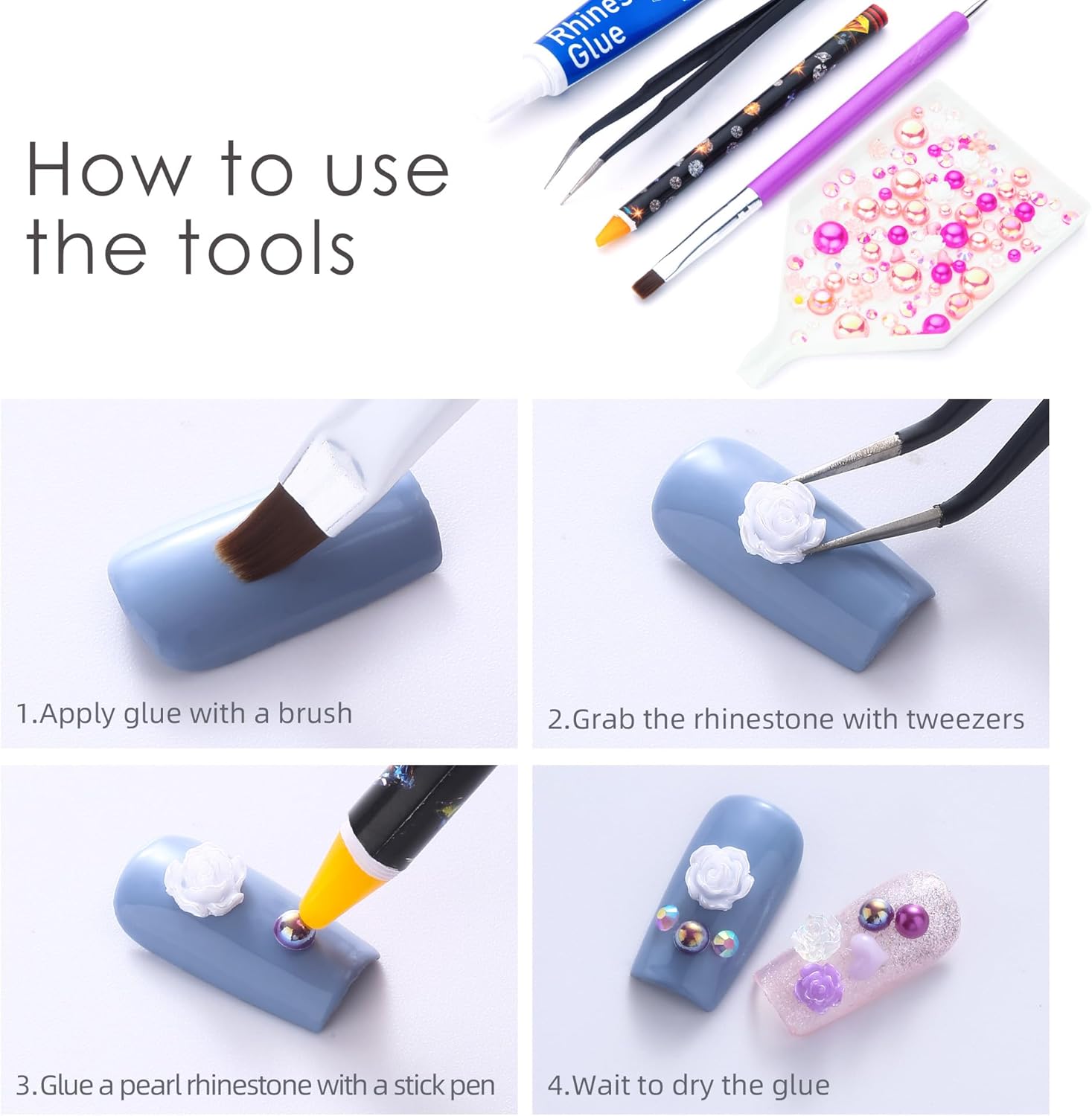 - Useful tools - These pearls and rhinestones have a flat back, which is excellent for easy placement.and you can pick up any large or small pearls and rhinestones with the crayons we bring along. And use the brush to smooth out the Gel, these tools will work very well