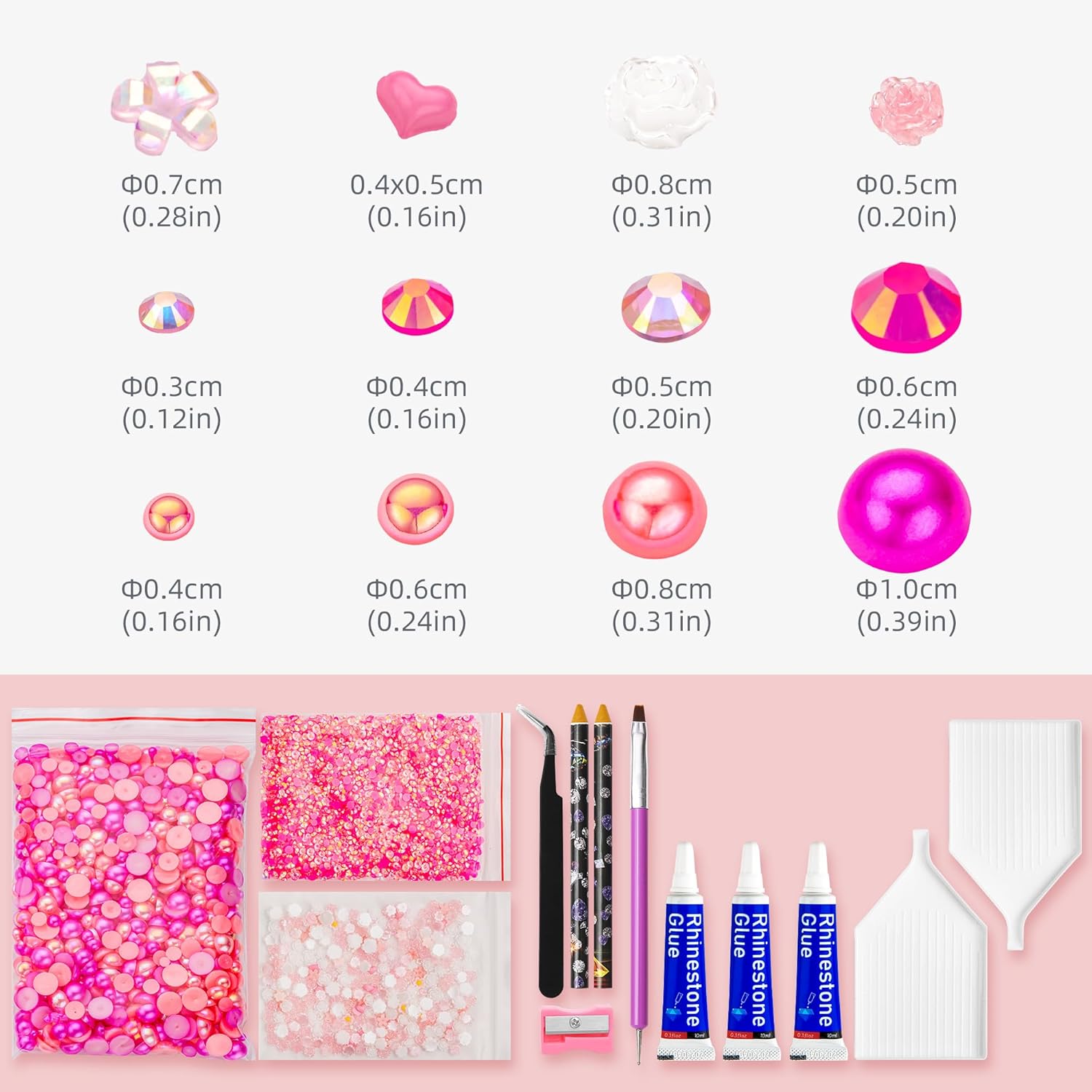 - What You Will Receive: 60g(30g*2)mixed size flat back pearls and rhinestones. 3*Rhinestone Glue. 1* wax pencil for rhinestones. 1*Pencil sharpener(color random). The mix half round pearls and rhinestones can make more beautiful handicrafts for your friends, parents, yourselfs on any festivals.If you need a mixed size pack of pearl rhinestones
