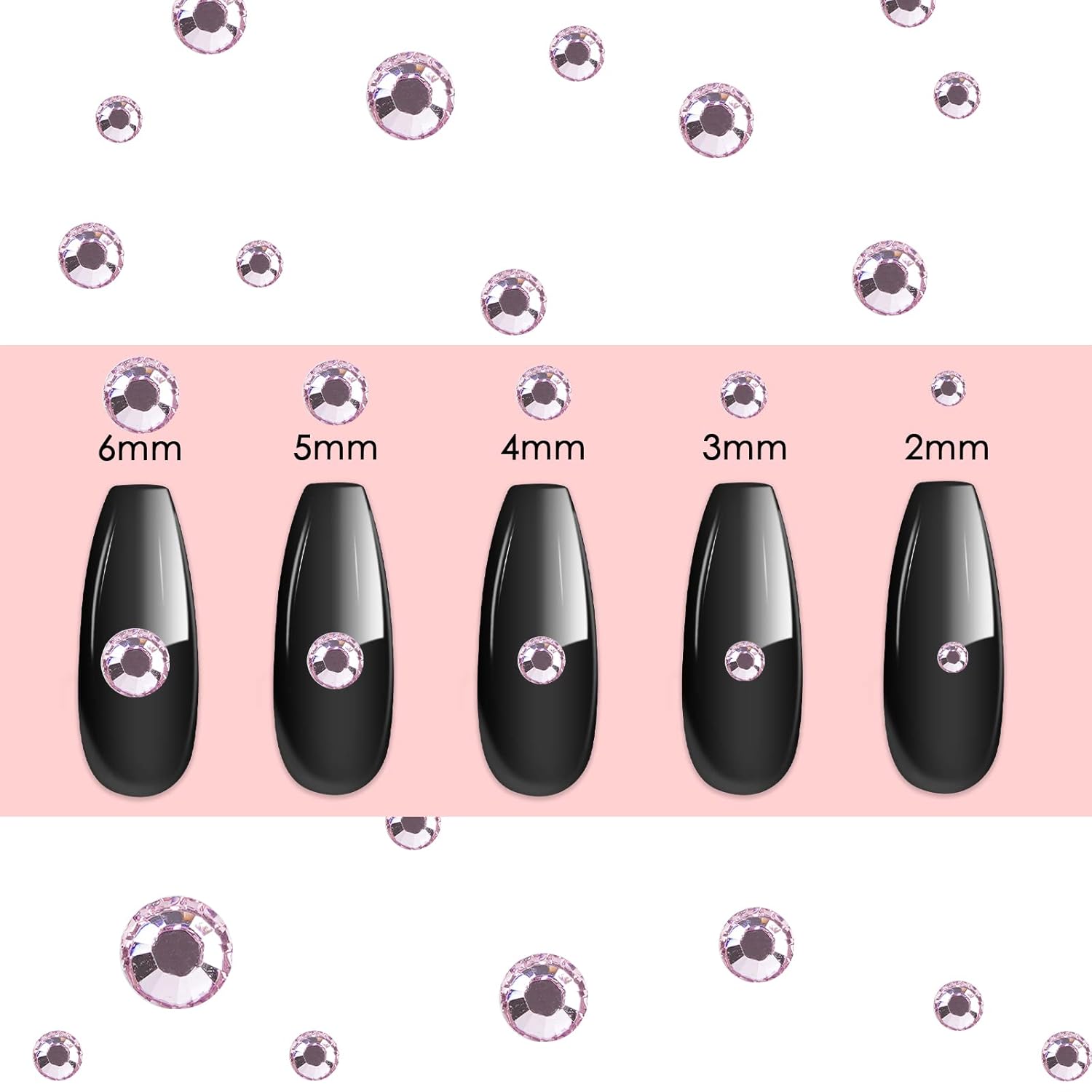 - PINK RHINESTONES WITH 12 GRIDS - They are 2mm, 3mm, 4mm, 5mm, 6mm. Meet your needs of nail art design, enough to succeed a complete clothing and shoes crafts project.