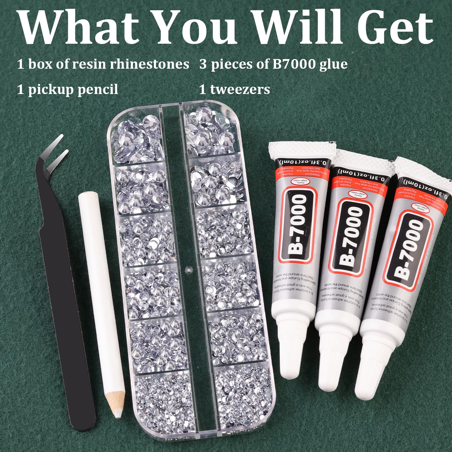 - WHAT YOU WILL GET -- The package includes 1 box of flatback rhinestones with 12 grids in diffrent sizes:2mm x 2 grids, 3mm x 3 grids, 4mm x 3 grids, 5mm x 2 grids, 6mm x 2 grids. 1 tweezers for large size gems, 1 pickup pen for small size gems. 3 B7000 adhesive jewels glue for jewelry making.This rhinestone kit makes it easy for you to make any craft you like, and will bedazzle your artworks!