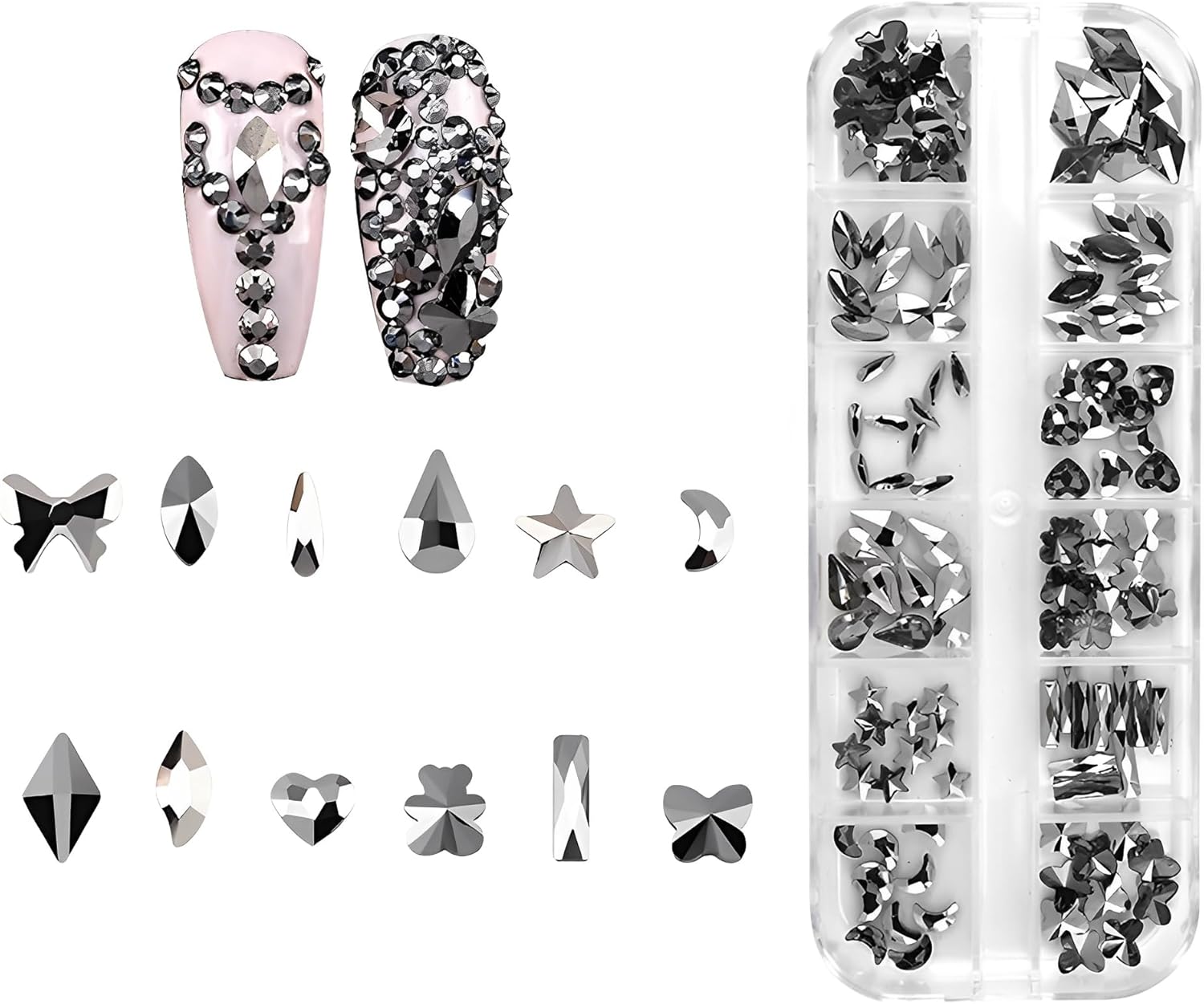 120pcs Flatback Rhinestones Glass Charms Diamantes Gems Stones for Nail Art Box Multi Shapes Jet Hematite