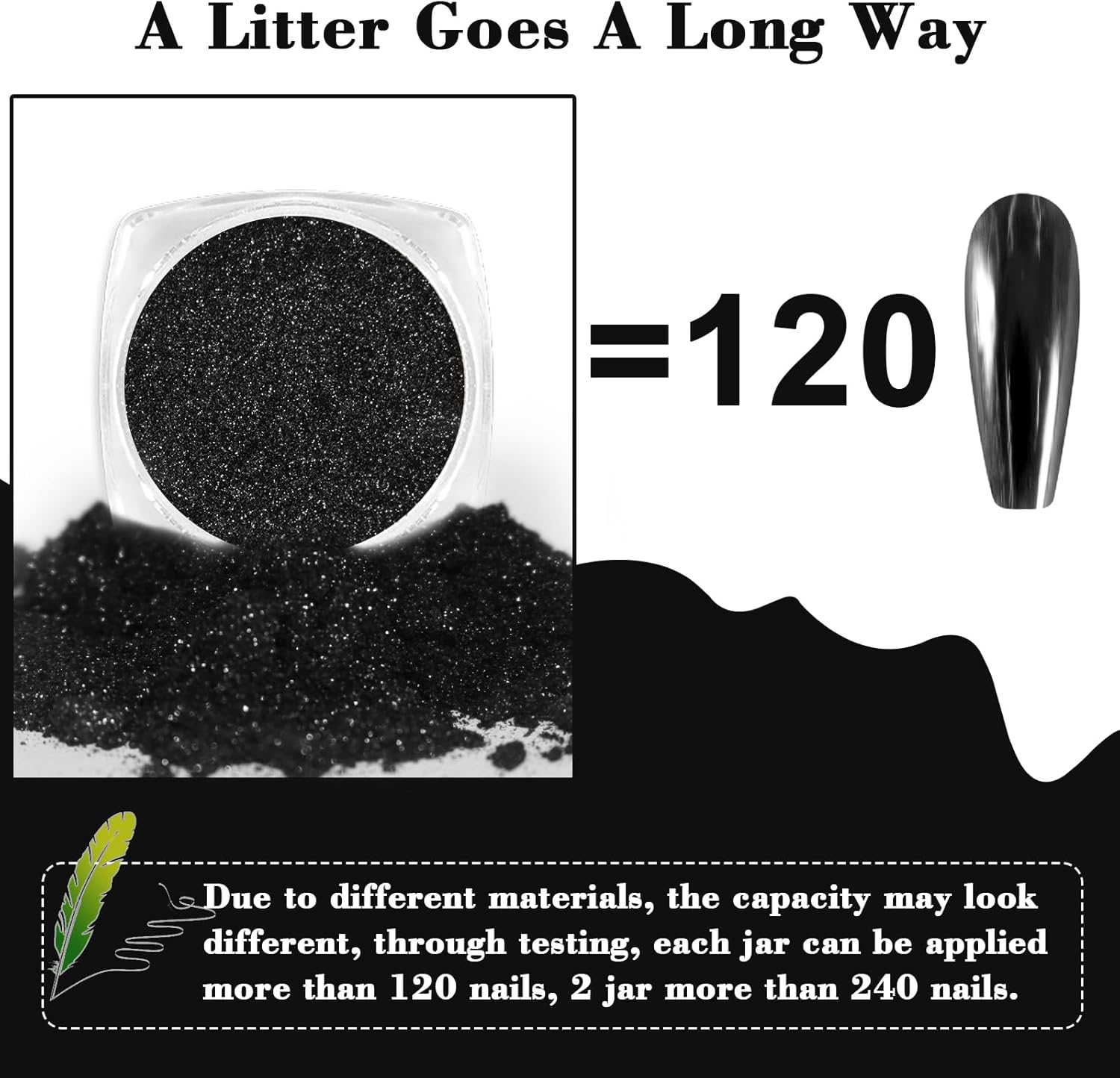 - Great Mirror Effect: It is an ideal black chrome nail powder and silver chrome nail powder kit to create a mirror effect, water ripple effect, bubble effect, star effect for your acrylic extensions, gel extensions, and gel polish manicures. The chrome glitter has delicate powder and attractive luster, which makes it have an excellent mirror effect. Create your unique nail art with Allstarry holographic chrome manicure pigment.