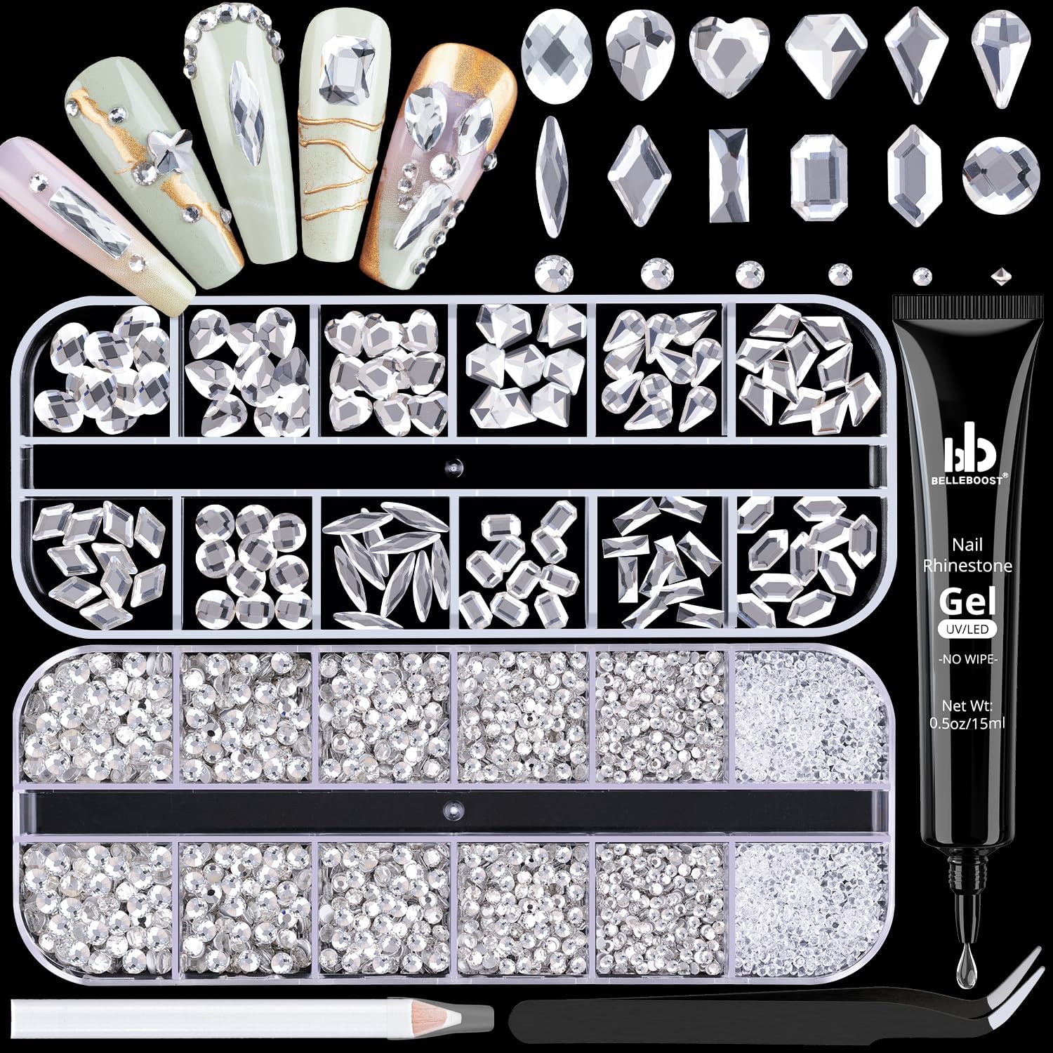 - 💎PACKAGE CONTENT -- The package contains 120Pcs multi shapes flatback gems crystal and 2510Pcs 1.5-4mm round beads, totally 2630Pcs Clear rhinestones. Additionally, 1 tweezers for large size gems and 1 pickup pen for small size gems. 1 15ml rhinestones glue gel for nail design. This rhinestones kit makes it easy for you to make any nail art you like, and will bedazzle your acrylic nails!