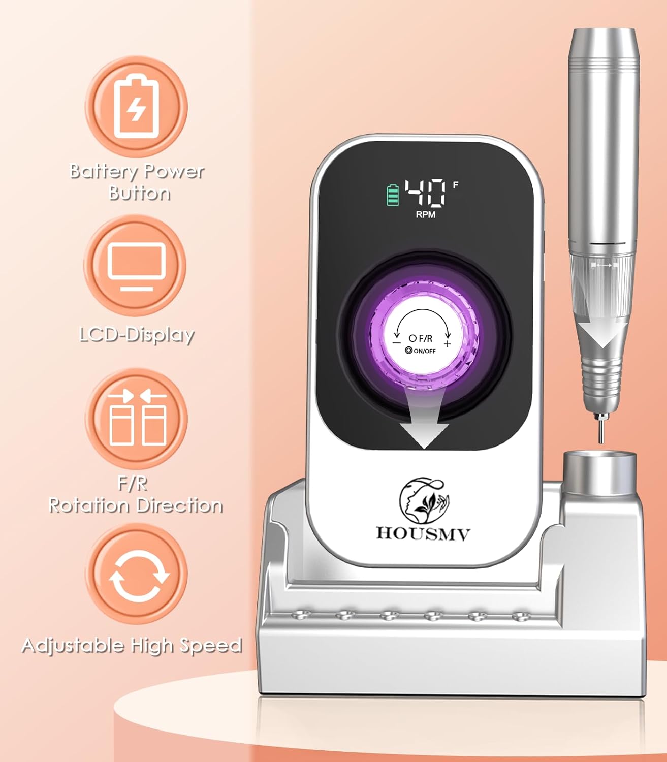 - ๐๐จ๐ง๐ -๐ฅ๐๐ฌ๐ญ๐ข๐ง๐ ๐๐๐ญ๐ญ๐๐ซ๐ฒ ๐๐ข๐๐: Our rechargeable nail drill features a large capacity battery, which offers 8-10 hours of usage just on 3 hours charge. The well-designed intelligent LCD display shows the rotation direction, speed, and remaining battery level, allowing you to conveniently adjust the speed and stay informed about the battery status.
