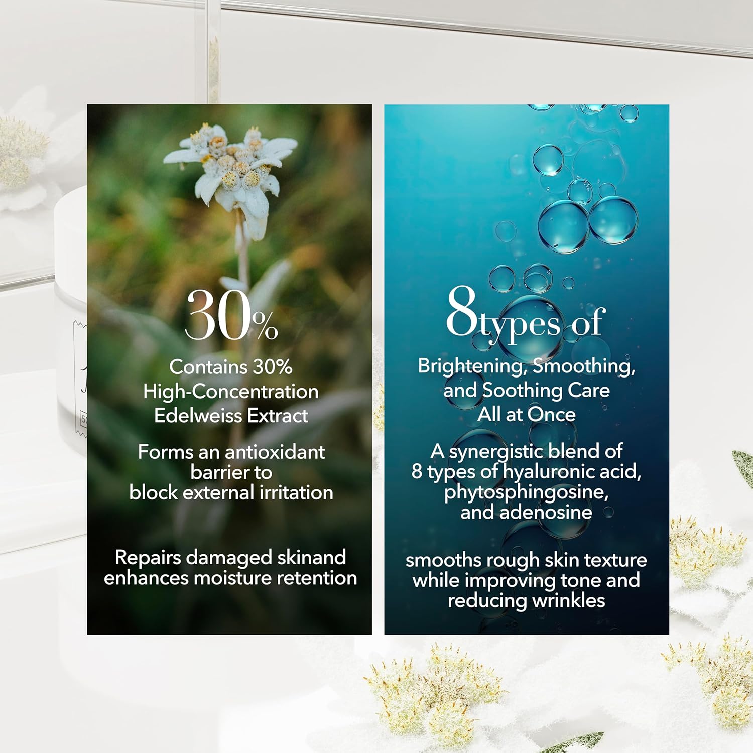 - Deep Hydration for Your Skin’s Glow: Infused with 30% Edelweiss extract and 8 types of hyaluronic acid. Deeply hydrates and restores even the driest skin, leaving it soft, smooth, and glowing
