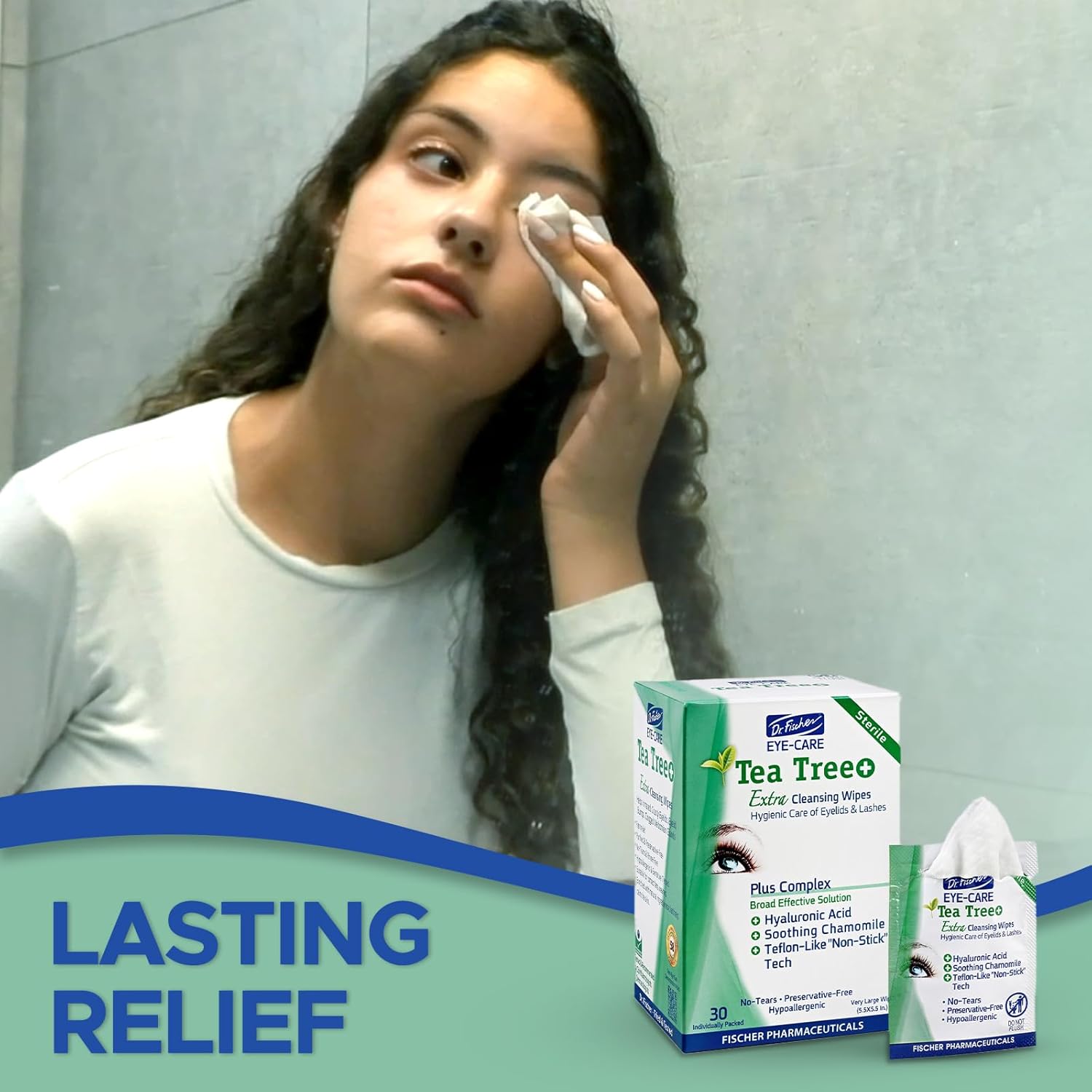 Dr. Fischer Tea Tree Oil Eye Wipes - Eyelid Wipes for Sensitive Eyes with Hyaluronic Acid and Chamomile, Makeup Remover, Daily Cleanser (60 wipes)