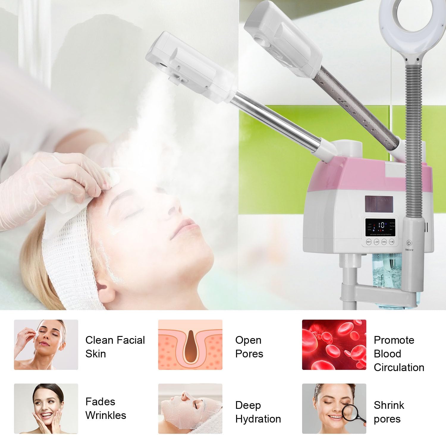 - 💗【3-in-1 Steamer】Design of dual nozzle cool/hot mist and 5X Magnifying Lamp, meeting your different needs. The hot mist opens pores and deeply cleanses oil and dirt, while the cold mist tightens pores, locks in moisture, reduces facial wrinkles, and make the skin delicate.