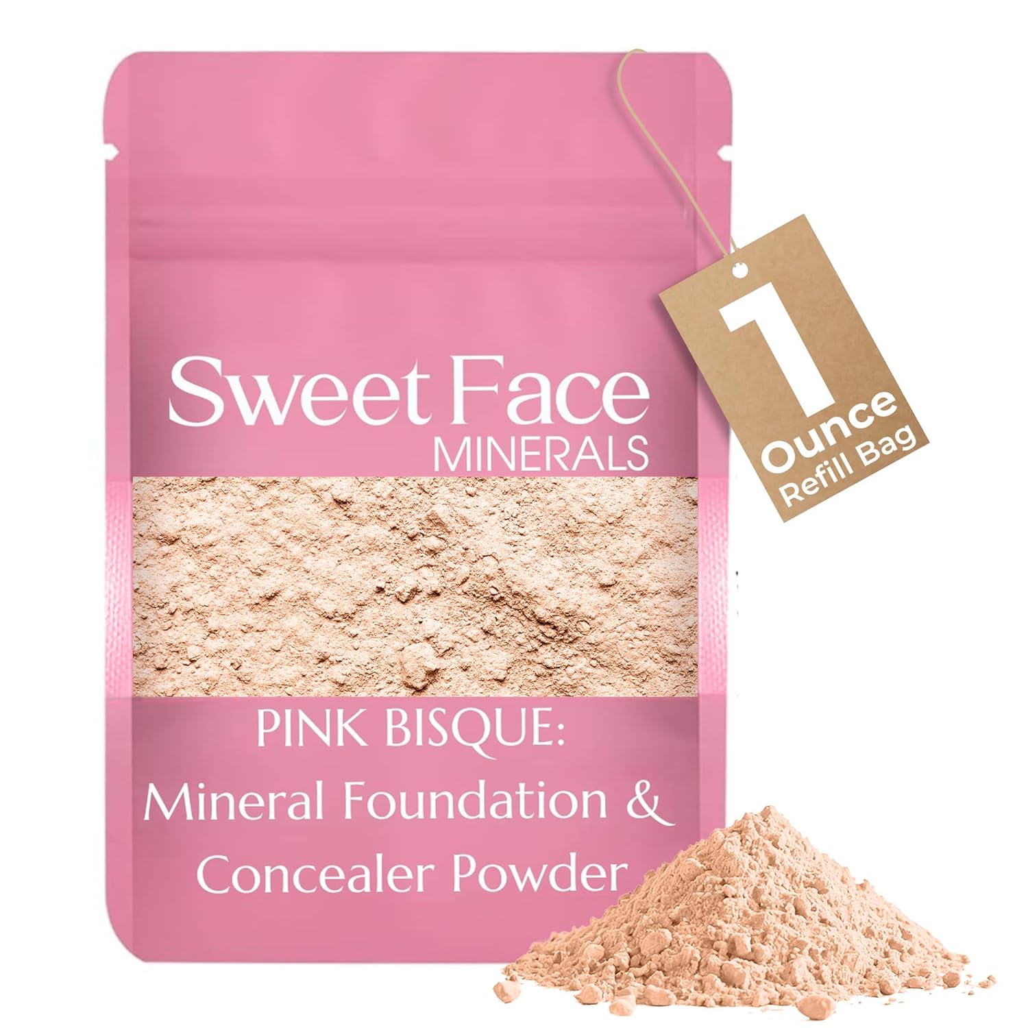 Foundation Powder Refill (Pink Bisque) (1 Ounce Bag) By Sweet Face Minerals, Lightweight Mineral Loose Makeup Powder with SPF 20, Full Coverage Flawless Finish, Talc-free, Cruelty-Free, Refill Pouch