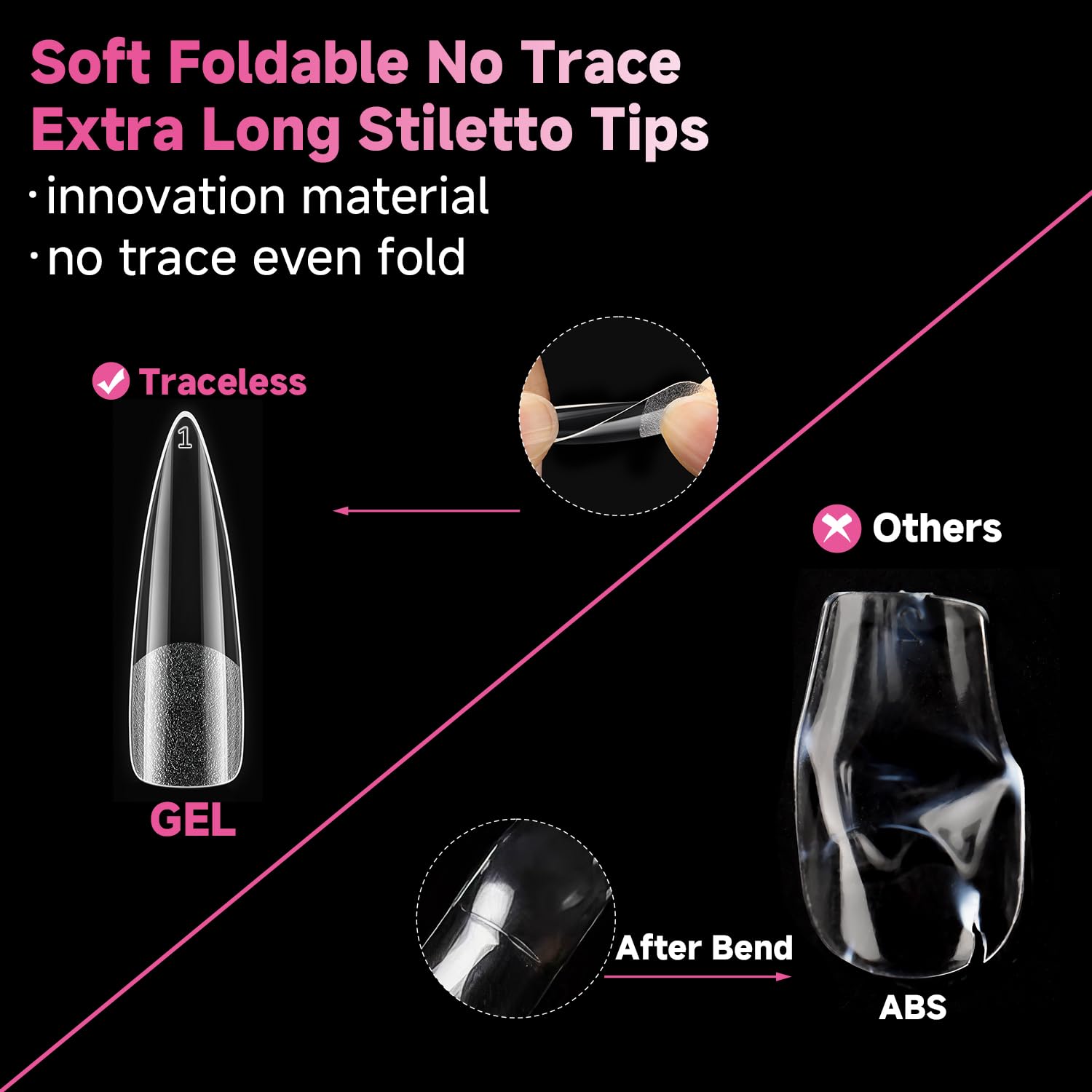 - ❤️【Stiletto Nail Tips with No Trace】The clear long stiletto nail tips are gelly soft tips and will make no trace even bend, you can more easily press, trim, paint flat false nails to make your dream nails shape, such as long stiletto nail tips, medium coffin nail tips, short almond nail tips.