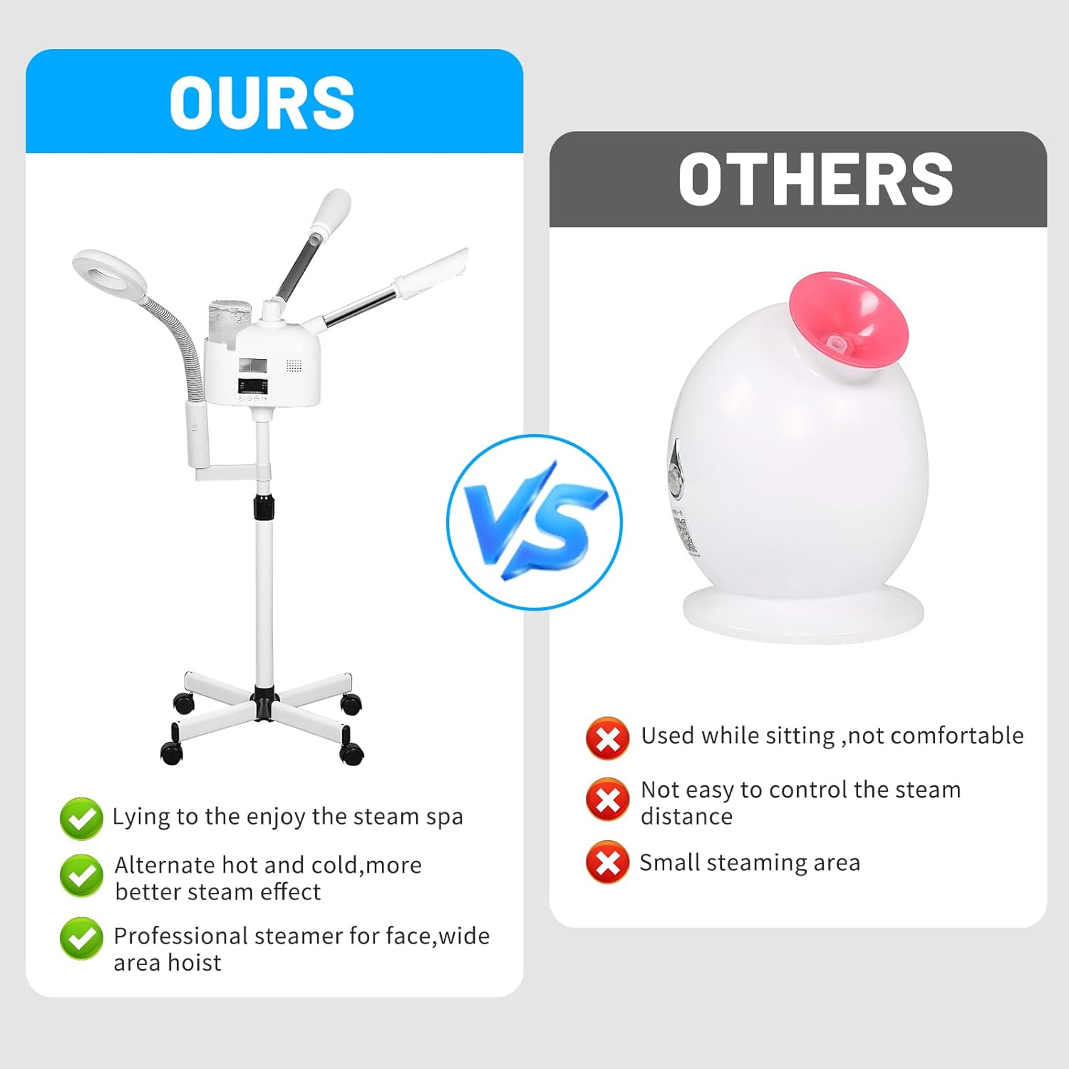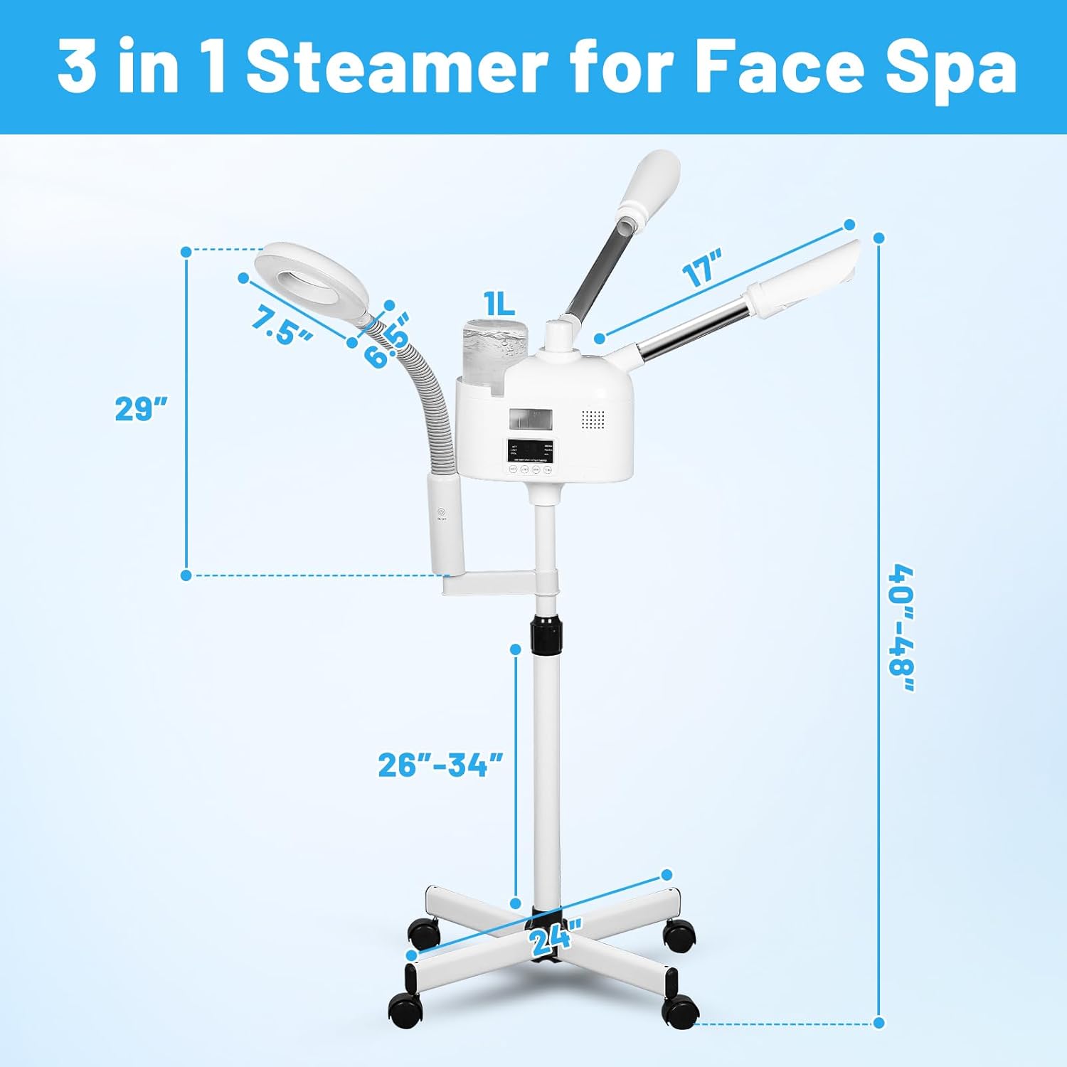 - GREAT QUALITY - Steamer for face spa on wheels,high quality warm stainless steel pipe, sturdy and durable, high capacity water cup, can store 1000ml water, the steamer generates the mist quickly with 1-3mins,the head of the machine is free to rotate 360Β°. Adjustable height from 38.1" - 48"
