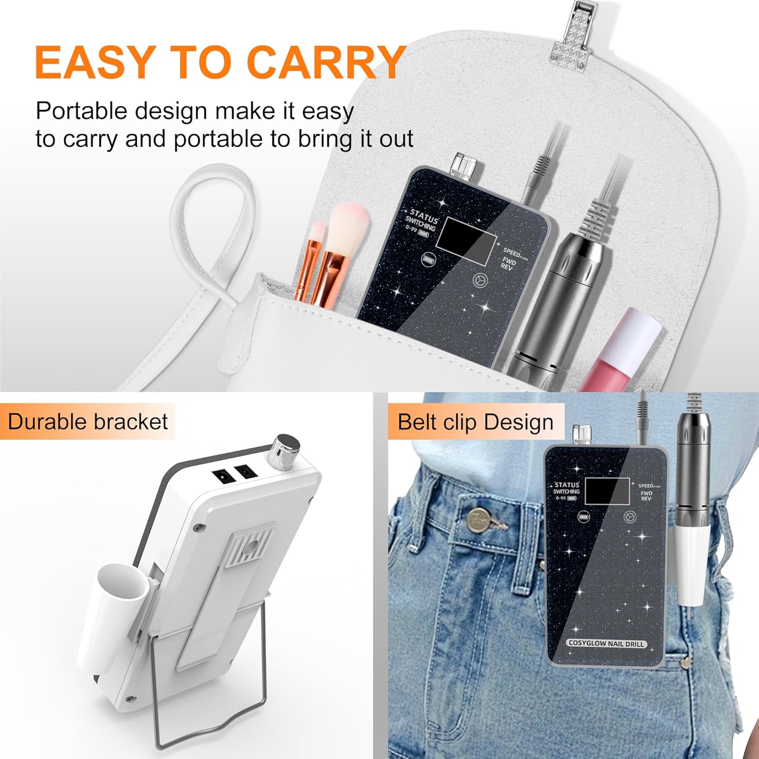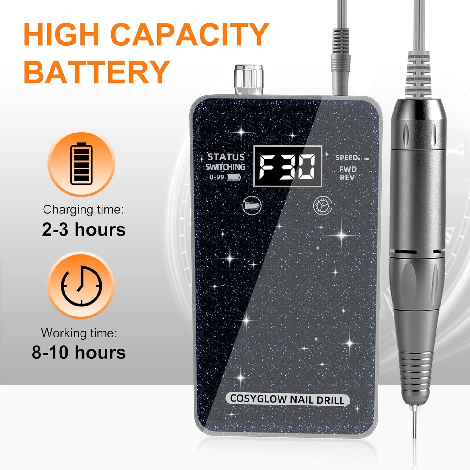 - Glitter Design Portable Nail Drill: This nail drill made of sturdy and durable reinforced glass and ABS material. It has a beautiful appearance and unique design. The specially designed glittery accents not only enhance the aesthetic appeal of the nail drill but also add an eye-catching sparkle.