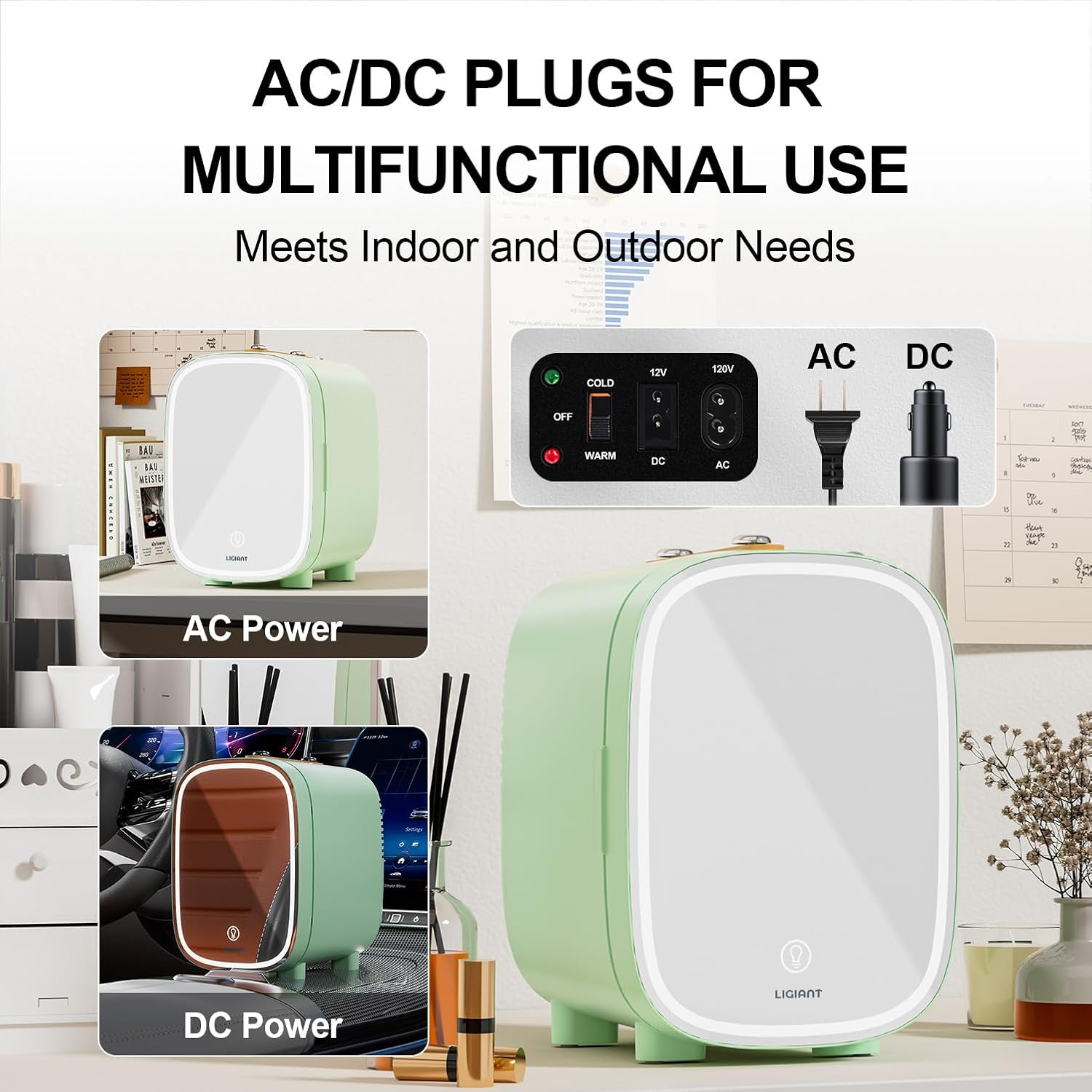 - Versatile Power Options: This makeup fridge for skincare comes with a household power cord (AC-110V), a car power cord (DC-12V), and a USB cable, offering flexible power choices for home, travel, or outdoor use.