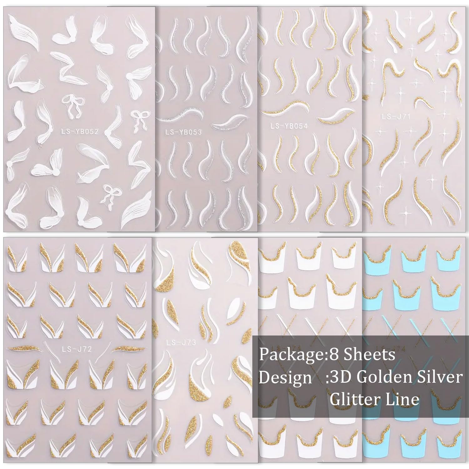 - 8 Sheets French Line Nail Stickers: Each sheet measures 3.74 x 2.56 inches, featuring over 200 designs including French lines, French tips, and bows to accommodate a variety of nail designs