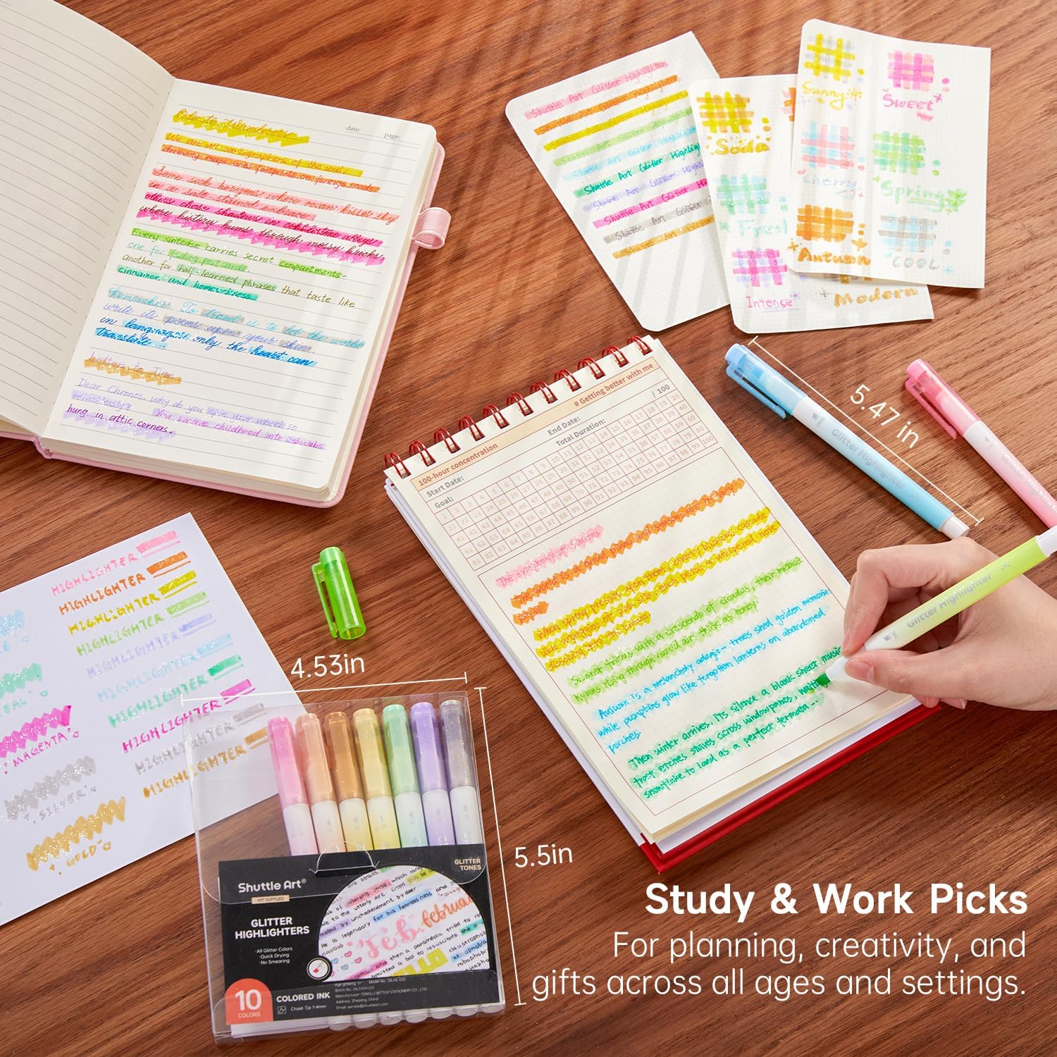 - SPARKLING COLORS & VERSATILE USE: 10 vibrant glitter fluorescent colors add a dazzling touch to Bibles, planners, textbooks, journals, and art projects. Ideal for students, artists, and professionals seeking creativity and elegance in everyday tasks.