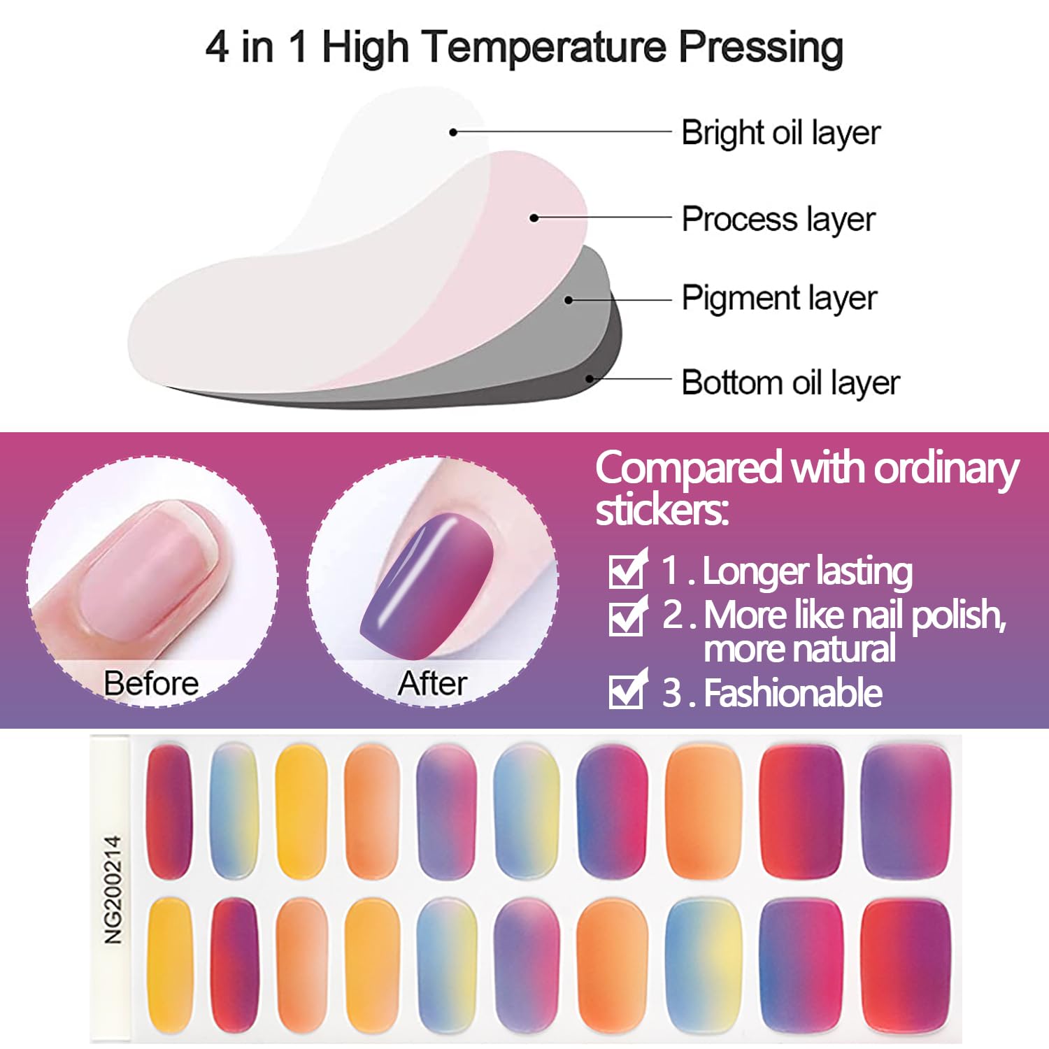 - [ THICKER AND EASY TO APPLY ] - Ideal nail art products for the girls who are not good at UV nail art to operate nail polishes, what you are needed to do is to chose size , put on, file down, cured by 60 seconds, get the salon-quality nail art designs within minutes, Removal is also quite easy, peel them off by wood stick or fingers.