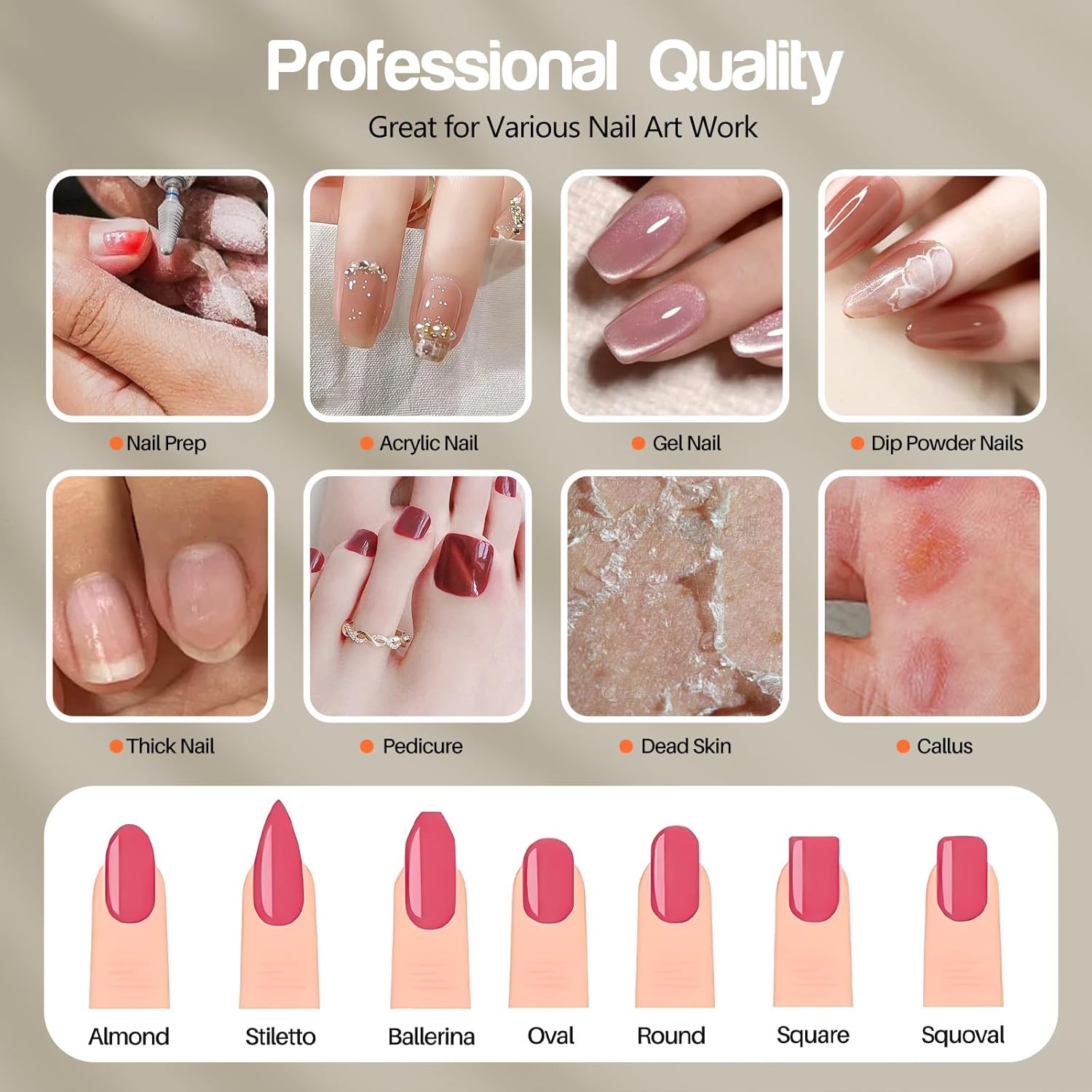- Multi-functional Professional Nail Set: A practical electric nail drill set, suitable for trimming, grinding, and polishing thick and fragile natural nails. It is ideal for removing cuticle, hard skin, calluses, and corns. Includes an electric nail file, 8 stainless steel nail drill bits, a Type-C charging cable, and an integrated LED light for precise nail filing.