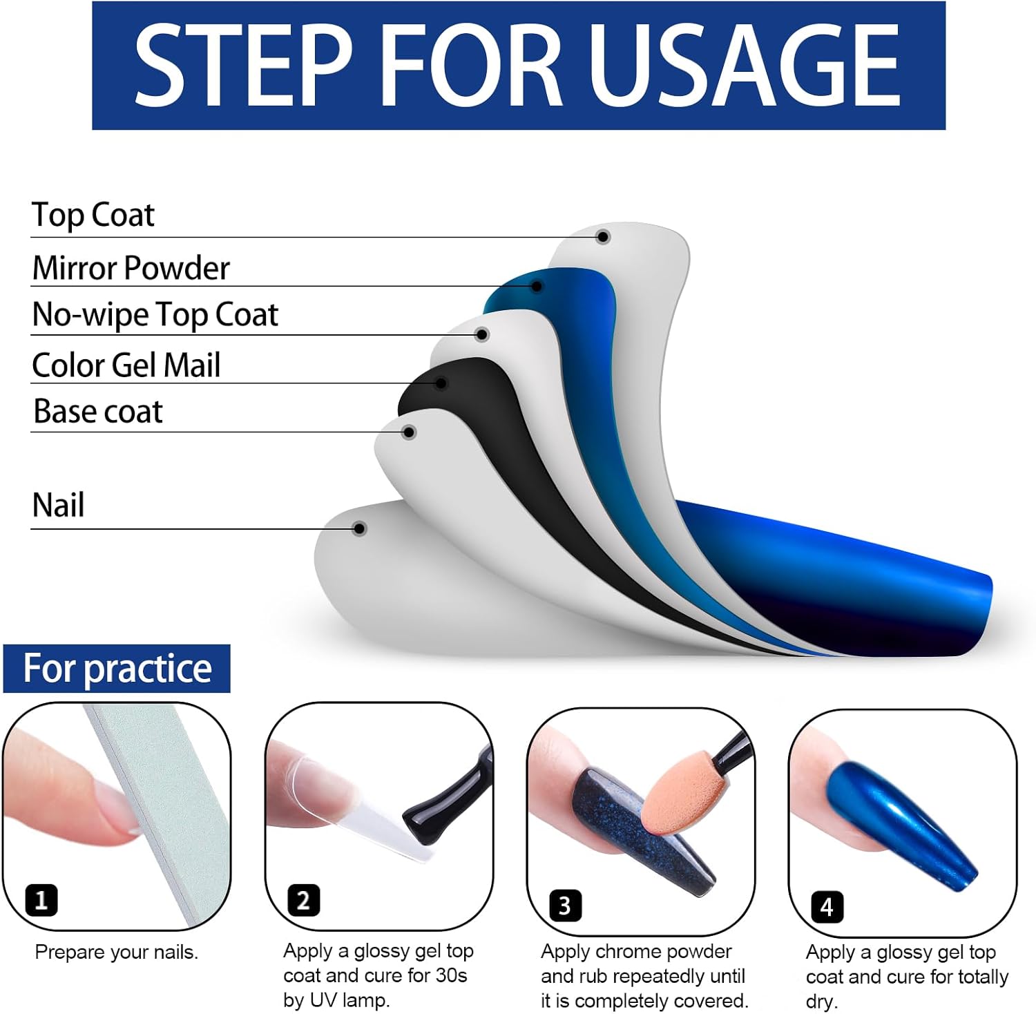 - The Scope Of Application::All chrome powders should only be applied to glossy No wipe top coat to embellish Nail-Polishes color. Otherwise it is unusable, it can't be applied directly to the nail, and it can't be applied directly to the skin. Artdone chrome powder can be applied on UV gel nails, acrylic nails or false nail tips. You can use them very easily