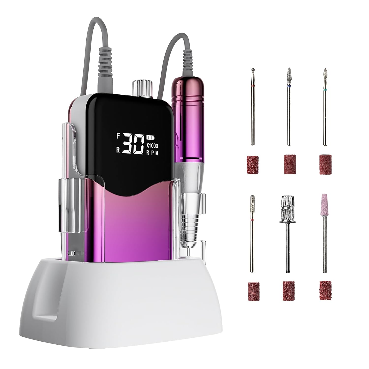 - Complete Nail Drill Kit: This electric nail drill comes with six interchangeable drill bits, including both metal and ceramic bits, making it perfect for use at home or in a salon. The kit also includes a convenient base for secure placement during use