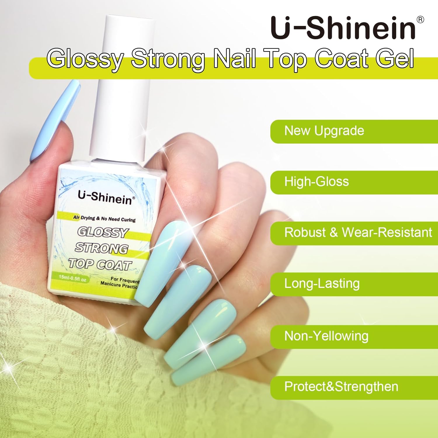 - U-SHINEIN STRONG HIGH GLOSS GEL TOP COA: The upgraded version of the top polish helps to protect the surface of the nails, strengthens the nails, provides long-lasting abrasion resistance, protects against scratches, chipping and other damages and prevents the nails from staining by other colours. It gives a long-lasting diamond-smooth effect and is suitable for layering over any colour of nail polish gel.
