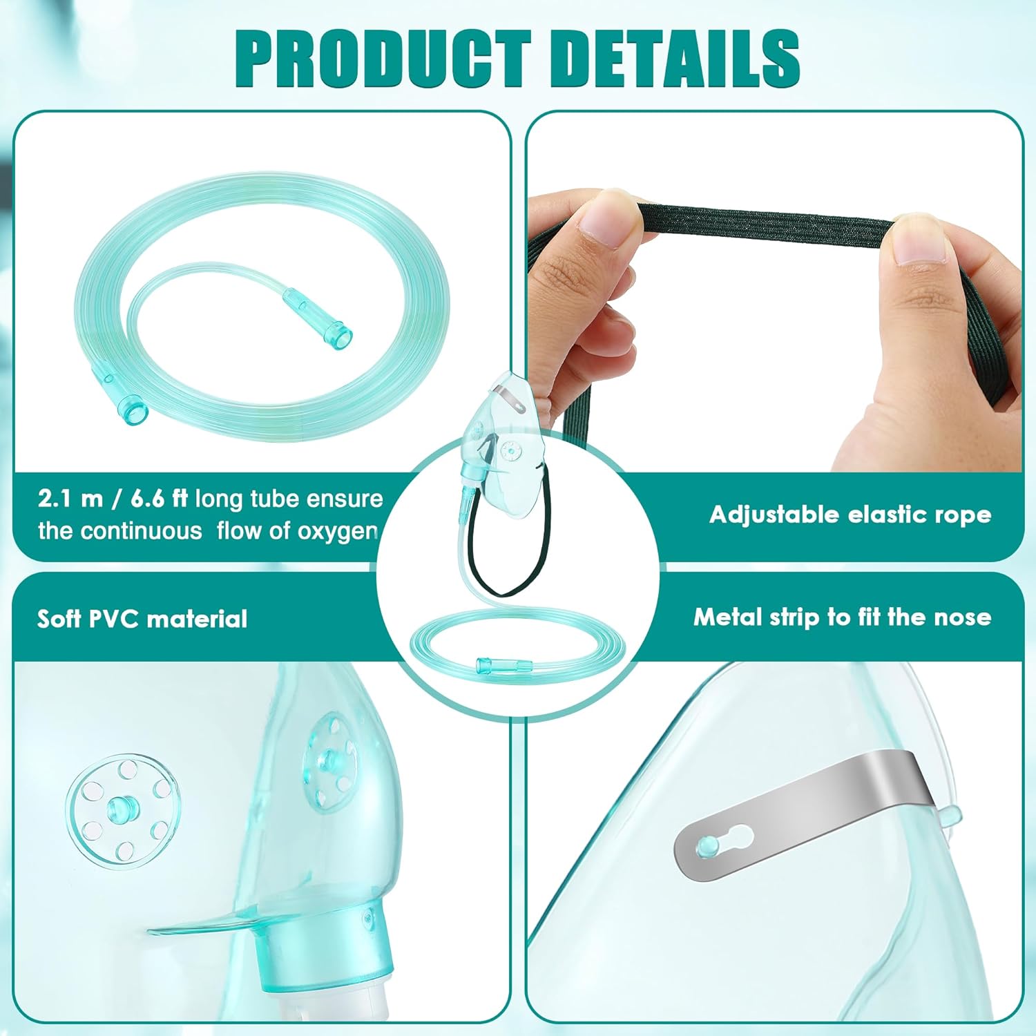 - Thoughtful Design: The oxygen mask comes with an adjustable elastic headband that suits different head sizes, ensuring a safe, comfortable fit without slipping. It is further enhanced by a malleable nose clip that allows for precise adjustment of the nose profile, proper sealing to ensure optimal oxygen delivery, and a 7 foot anti kinking tube that allows for barrier free movement and consistent oxygen flow; This feature also helps prevent oxygen leaks, maximizing efficiency