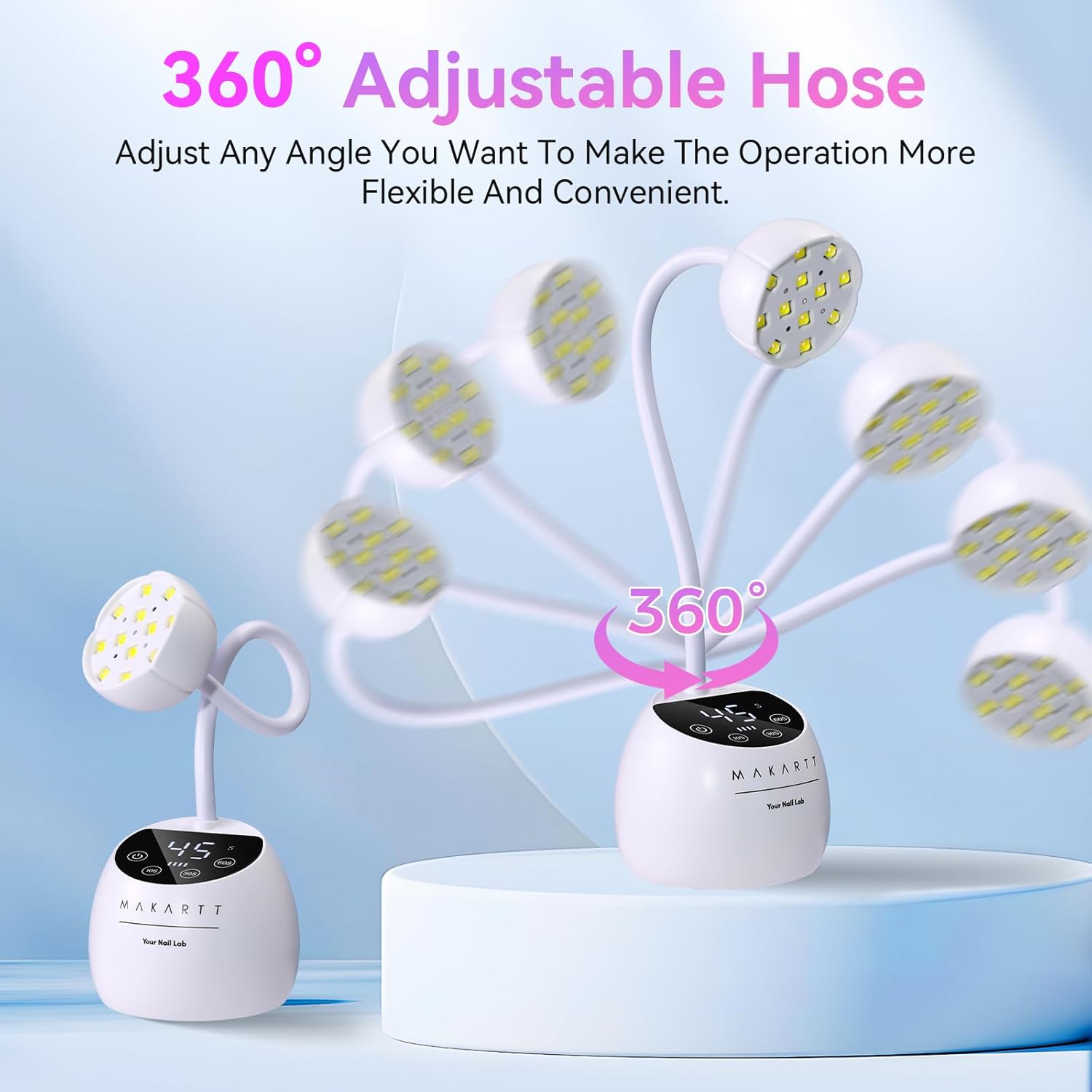 - 360ยฐ Degree Adjustable Direction: Makartt UV nail lamp features a flexible gooseneck, allowing you to bend and maneuver it to any angle for optimal curing. It ensures full coverage of gel nails, including hard-to-reach areas like your pinkies and thumbs, for flawless results every time.