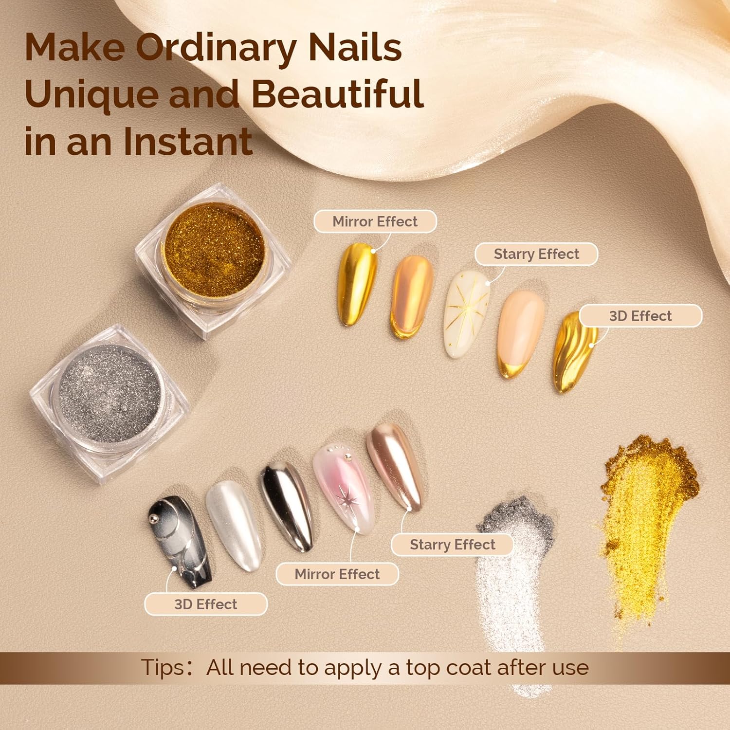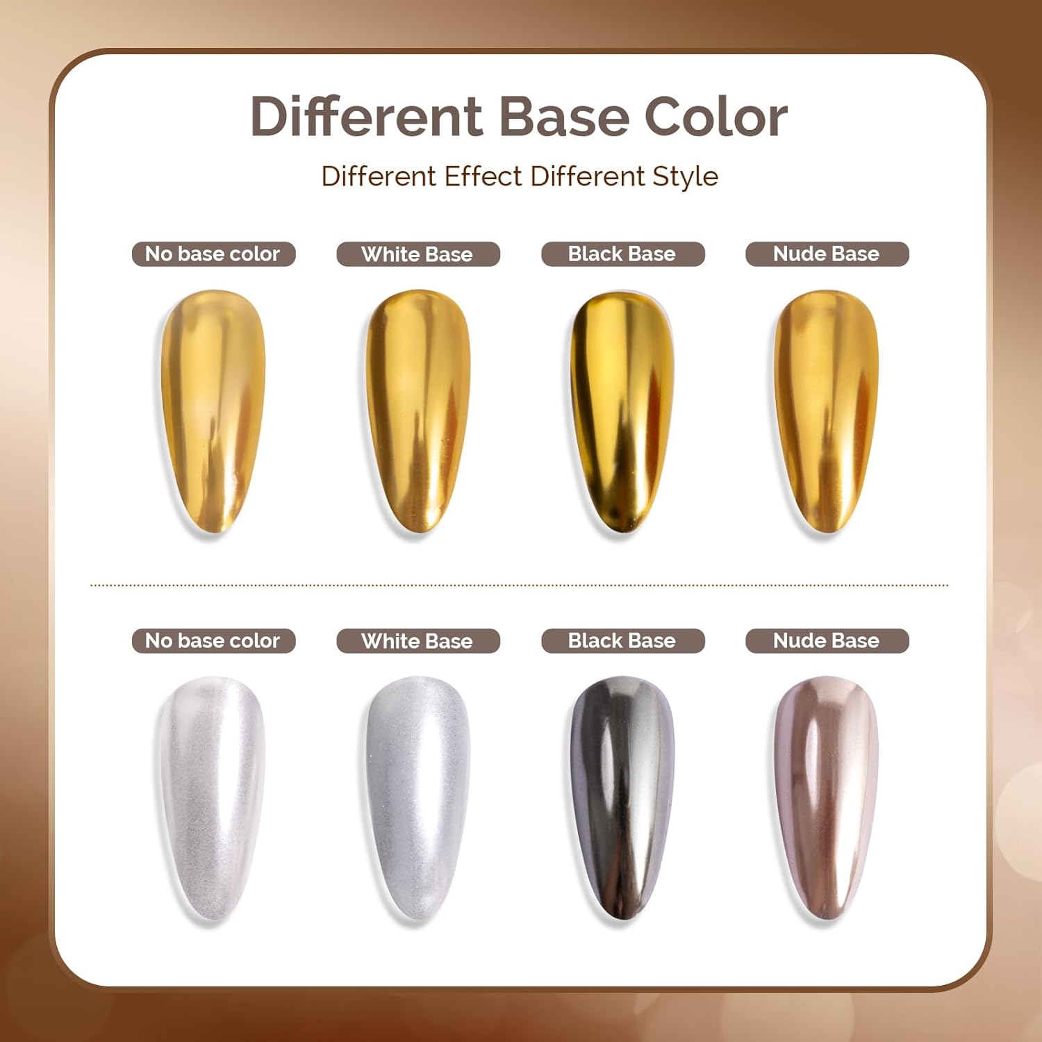 - Wide range of applications: suitable for UV gel nails, acrylic nails, natural nails or false nails. Easy to get a salon grade chrome effect without special techniques. Powder is easy to apply and suitable for beginners