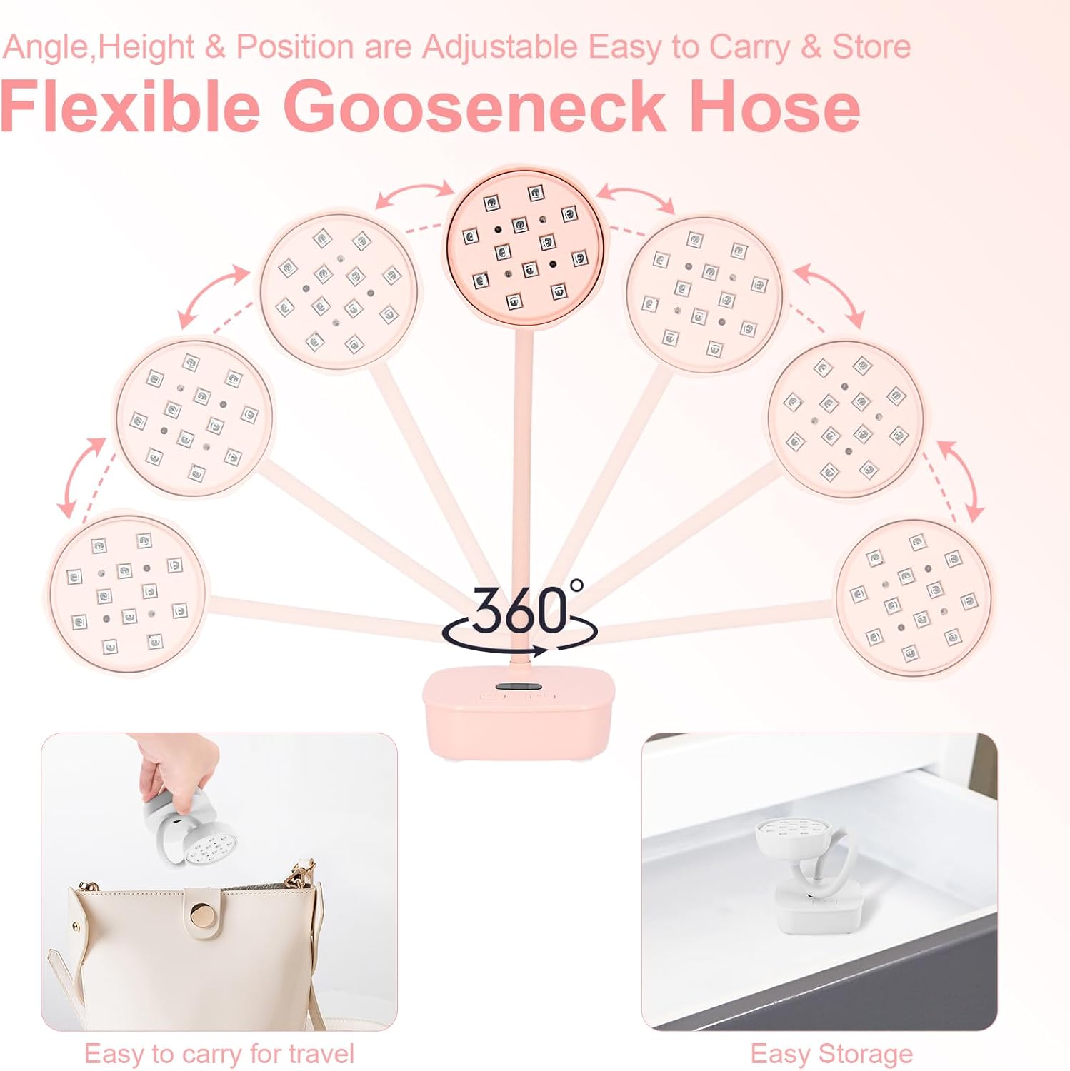 - Flexible Gooseneck:UV nail lamp features 360Β°adjustable and bendable gooseneck,which can flexibly adjust the height and direction of the UV lamp,stabilize various shapes,and let the light focus exactly where you need it without side light.